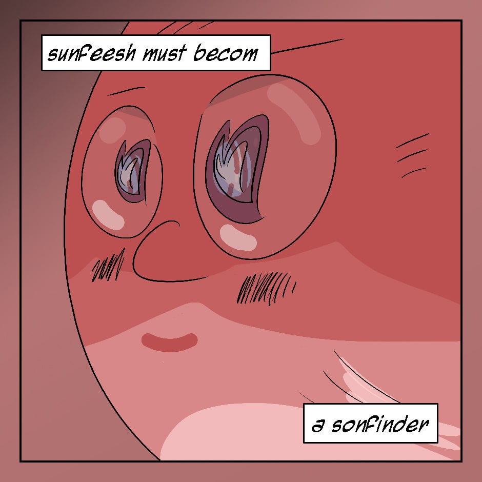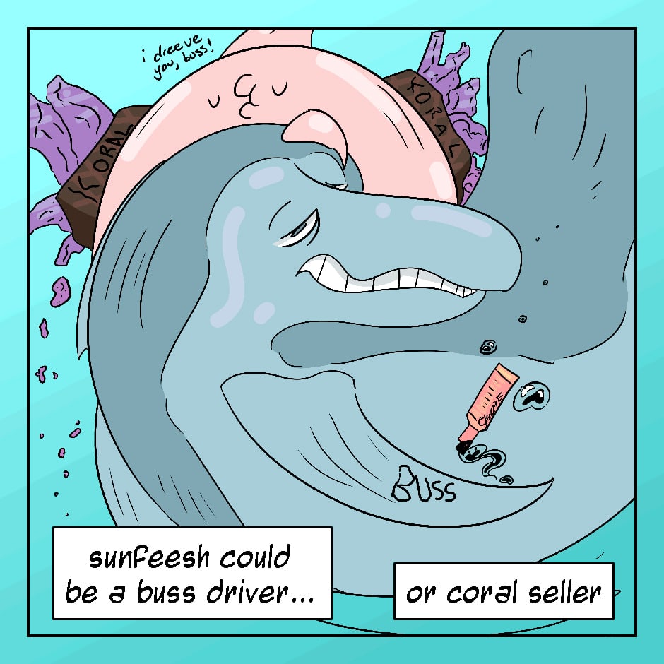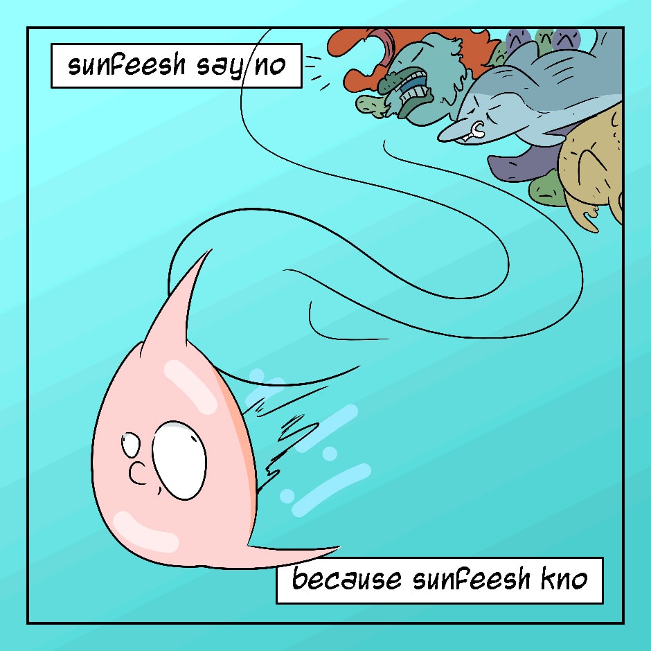 An ocean sunfish, being the size of a pickup truck, looks like nothing but a floating head complete with protruding lips and poor swimming ability. However, not even that marine biologist knows the sunfish's true ambitions, based in the fact they can lay 300,000,000 eggs in one sitting: sunfish live for their sonfish.