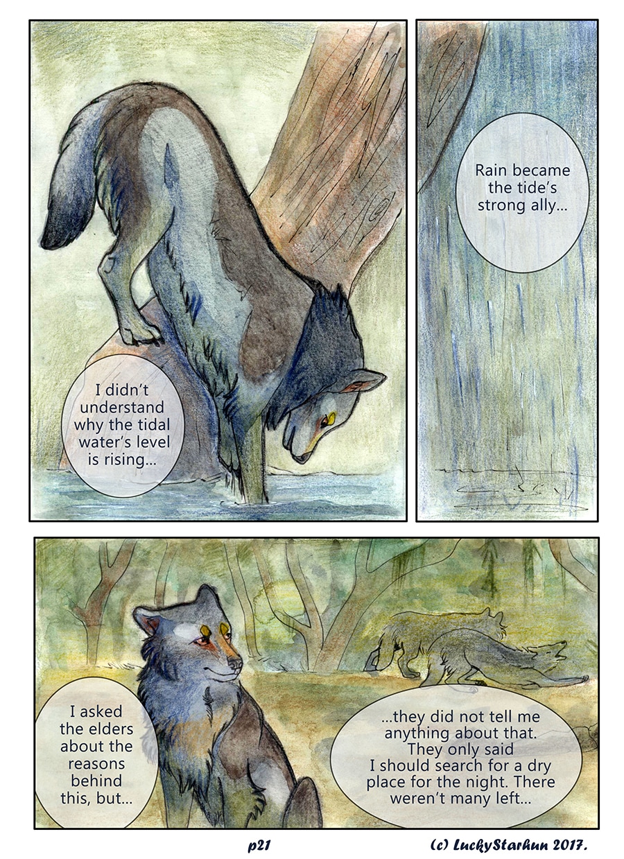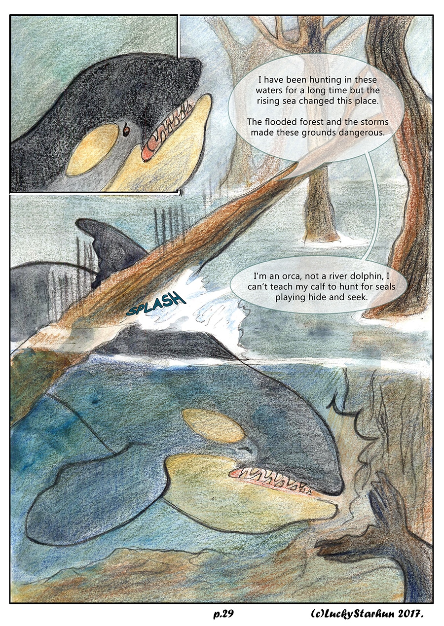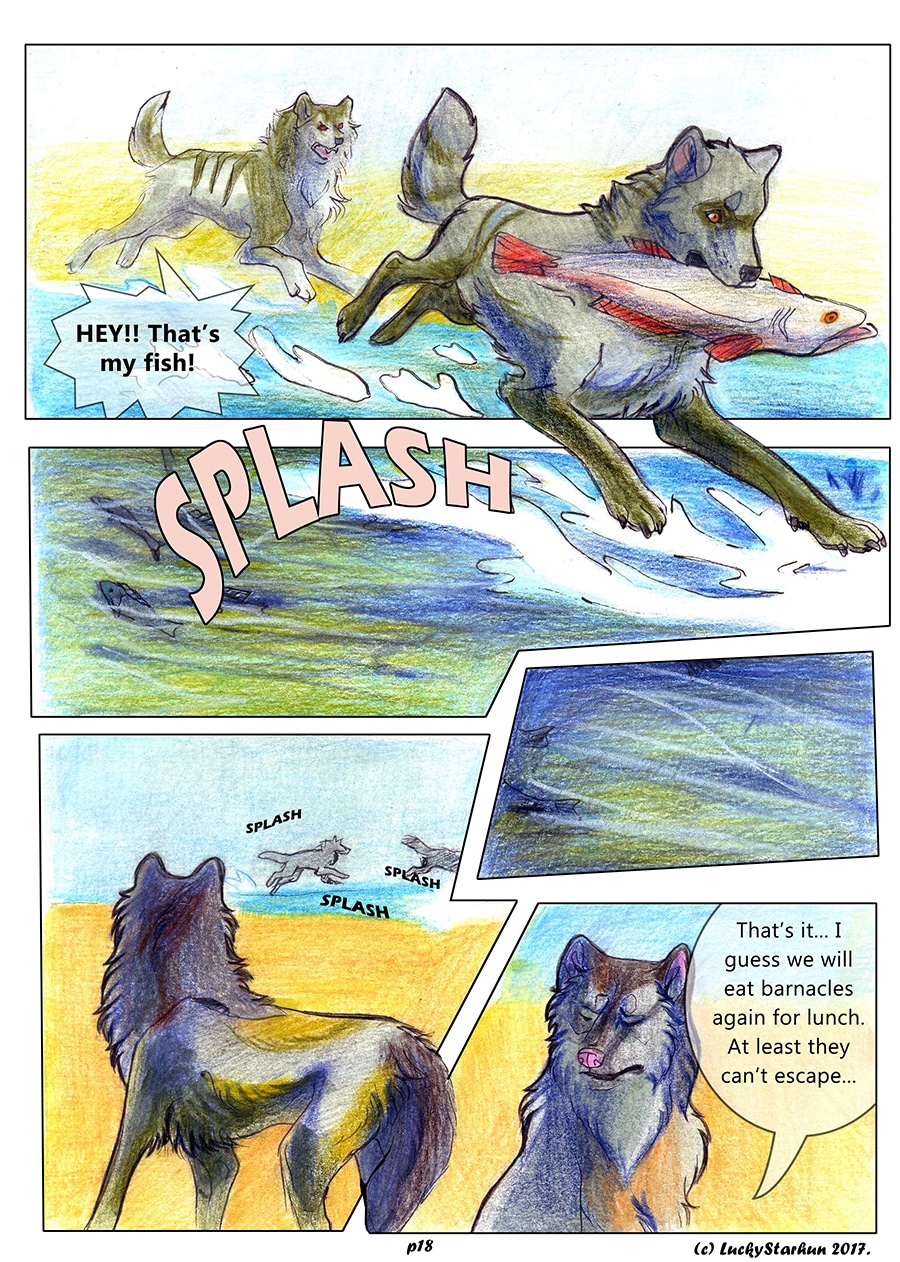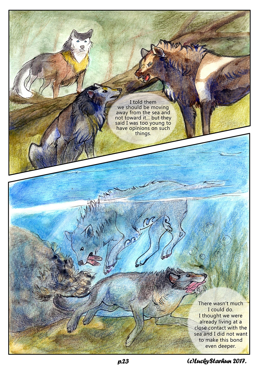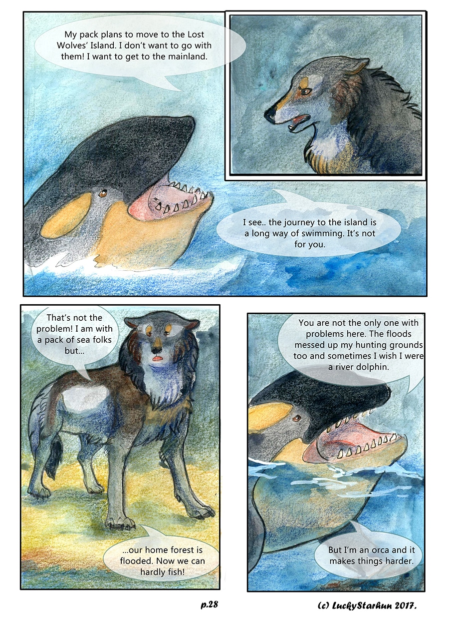 Water Wolves is an adventure comic which takes place in the near future, centered around a wolf pack trying to adapt to climate change. The comic also features other animals. It is suitable for all ages. It contains some topics that could raise opinions about the protection of the environment.