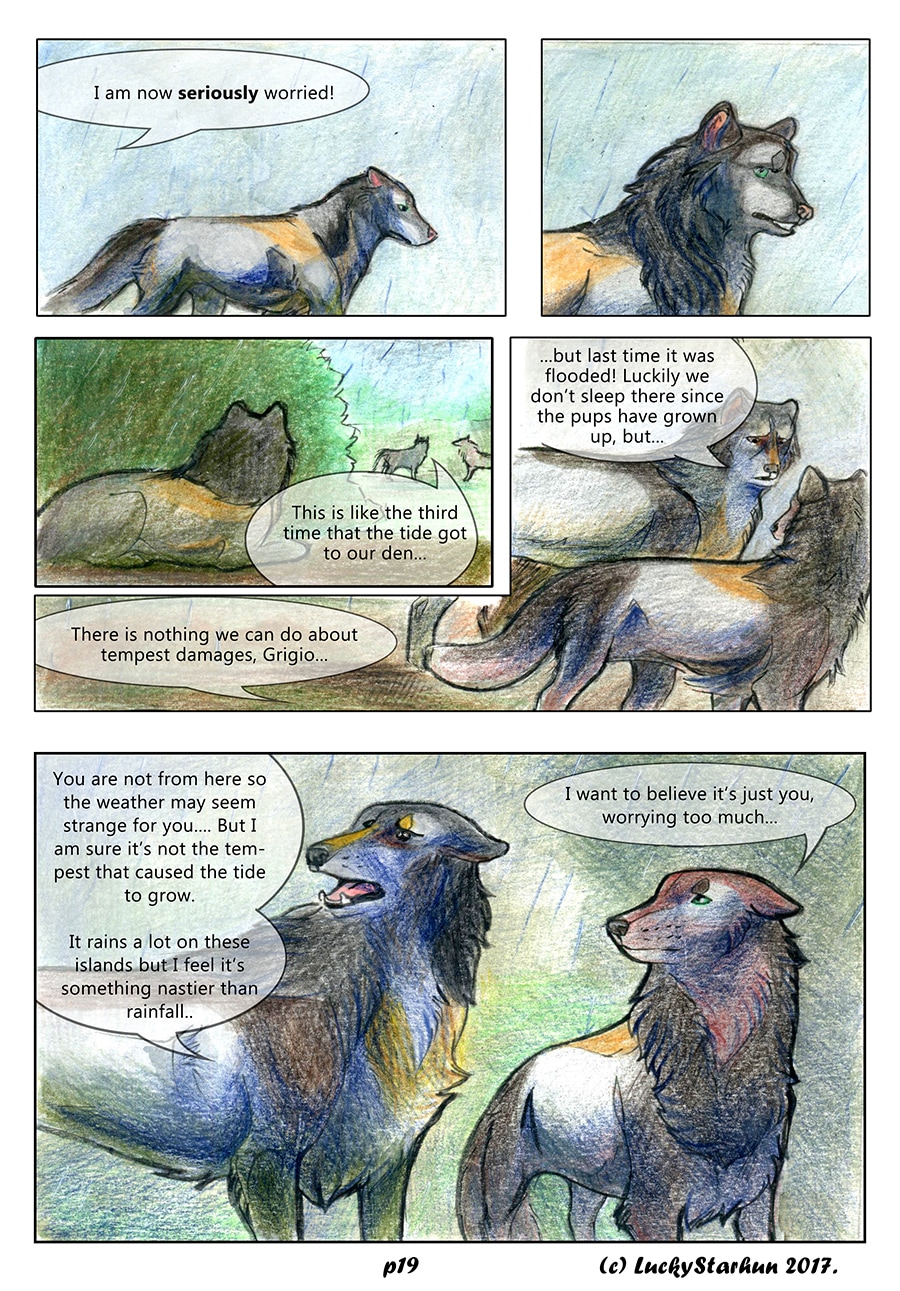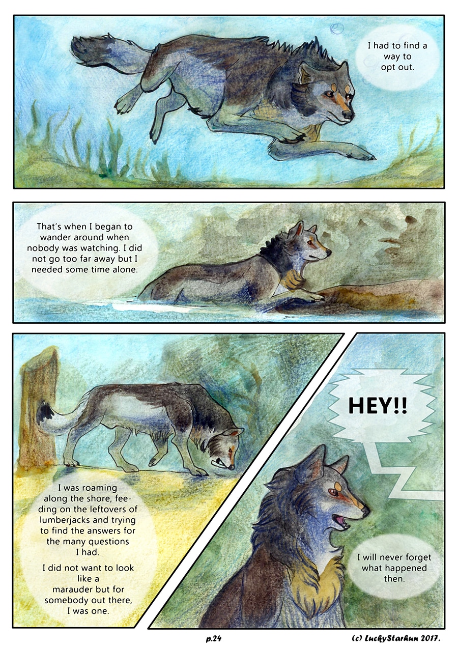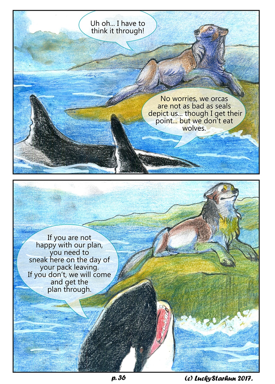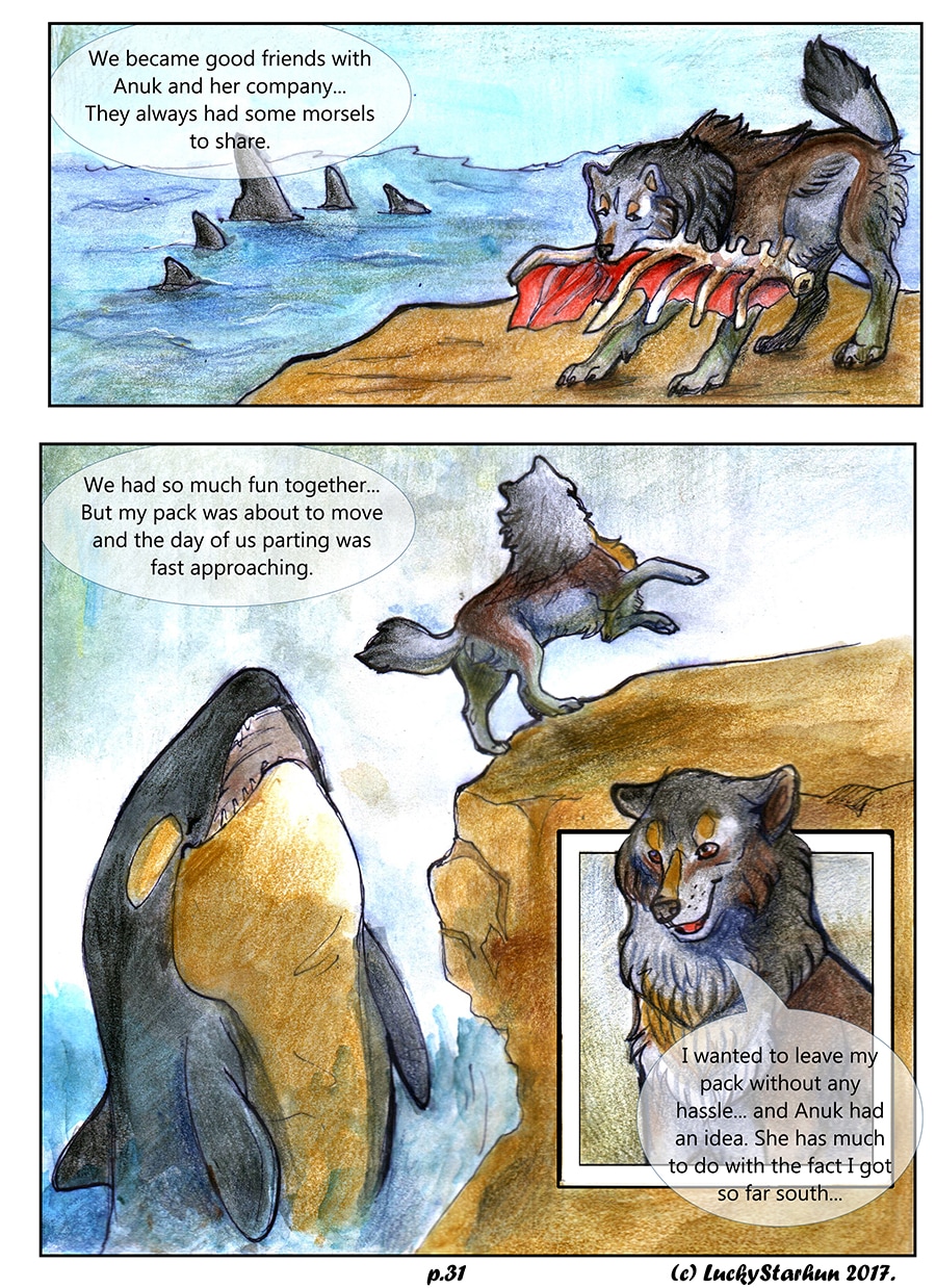 Water Wolves is an adventure comic which takes place in the near future, centered around a wolf pack trying to adapt to climate change. The comic also features other animals. It is suitable for all ages. It contains some topics that could raise opinions about the protection of the environment.