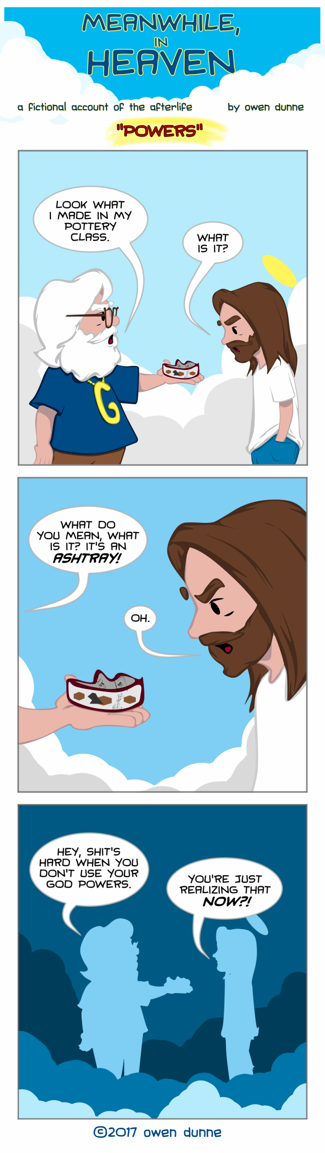 Welcome to Meanwhile, In Heaven! Ever wonder what the Almighty really thinks? What’s really going on up in the great hereafter? Well now you can find out! Join us every Monday, Wednesday and Friday as we follow the adventures of the Heavenly gang! Every M-W-F