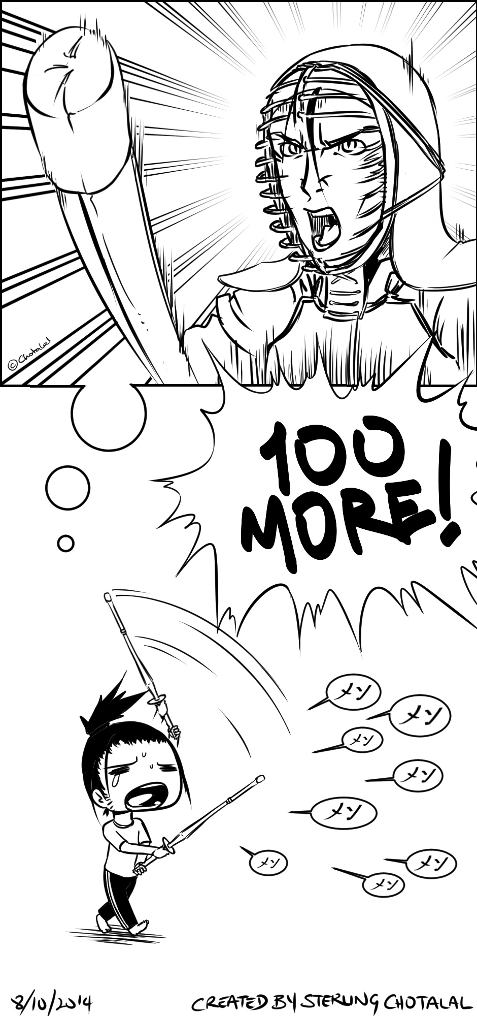 As the only new student, matching the pace of my senpais is difficult. The japanese katakana in the bubbles mean "men", which is a head strike.