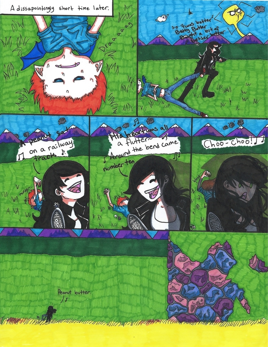 The song Alex sings in the 3-6th panels is: A peanut sat on a railway track, his heart was all a flutter. Around the bend came number ten, choo choo! Peanut butter.
