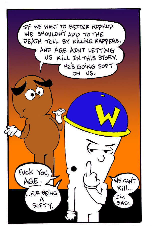 Won & Phil, Hip-Hop Music Heroes continue to fight against the evilness that pollutes and destroys the sacred culture known as Hip-Hop. Created, written, and illustrated by Age Scott. Color by Mike Hampton