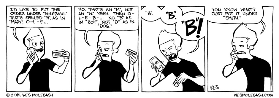Having a weird last name means you have to spell it a lot for people. Especially if you're placing an order or making a reservation. I hate spelling my last name over the phone to people, so I've recently taken to using my first name when I order pizza. I feel like the name "Wes" is pretty hard to screw up.