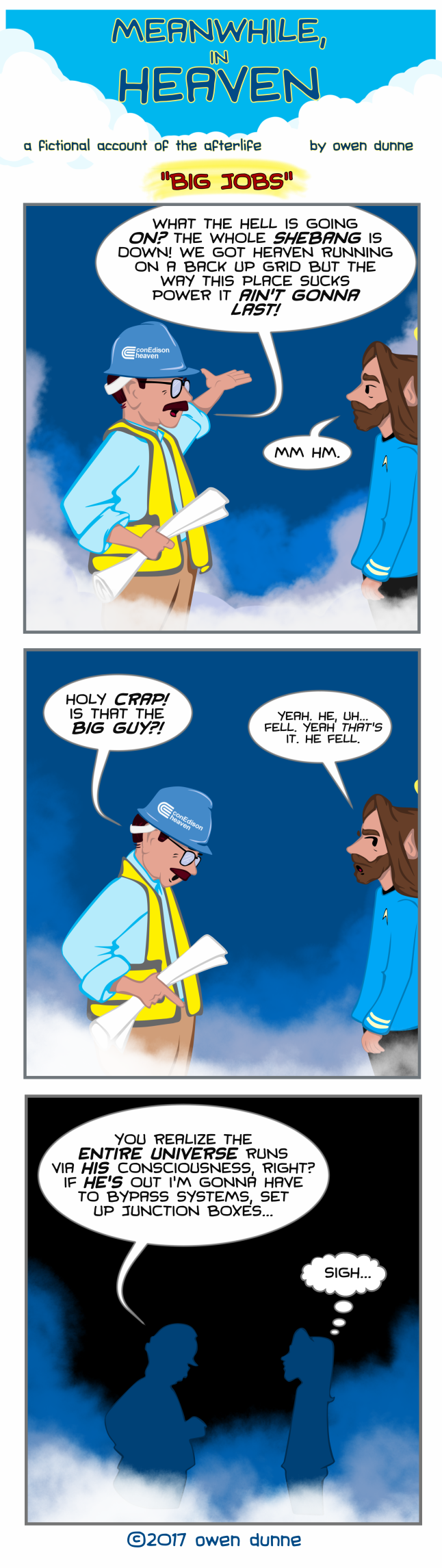 Welcome to Meanwhile, In Heaven! Ever wonder what the Almighty really thinks? What’s really going on up in the great hereafter? Well now you can find out! Join us every Monday, Wednesday and Friday as we follow the adventures of the Heavenly gang! Every M-W-F