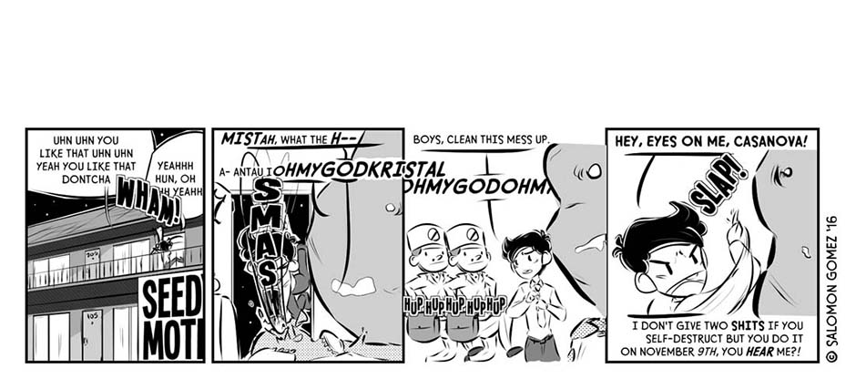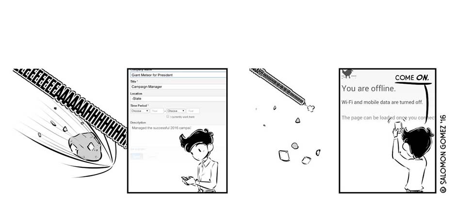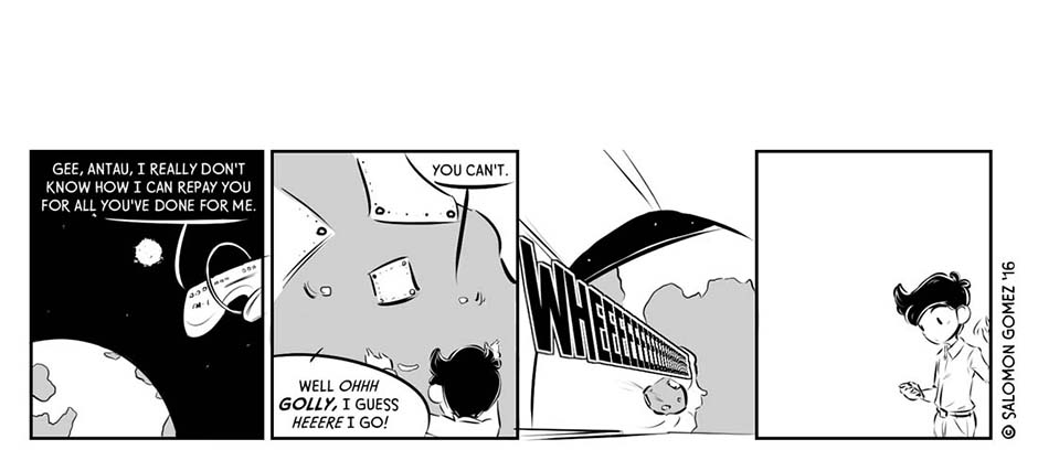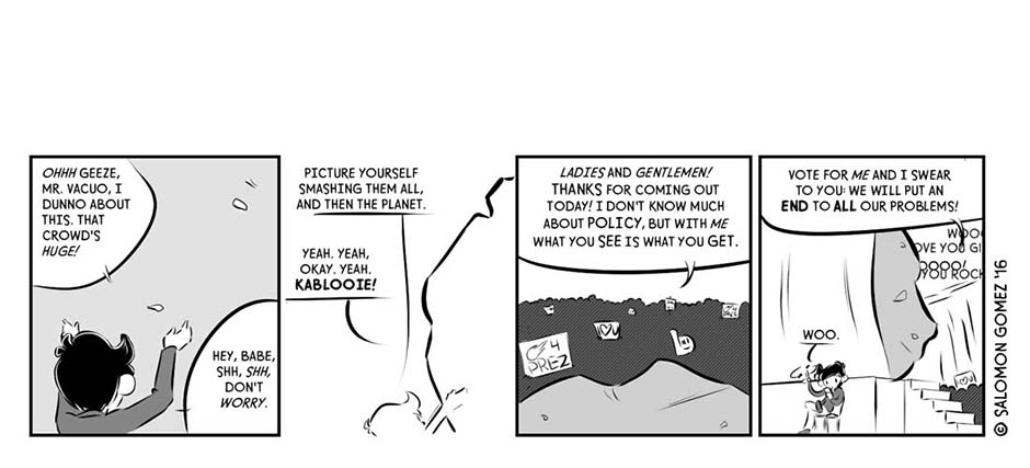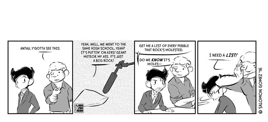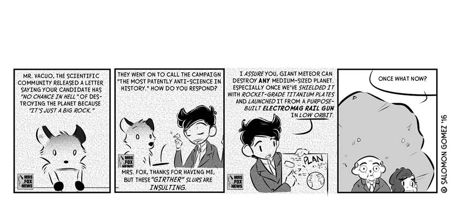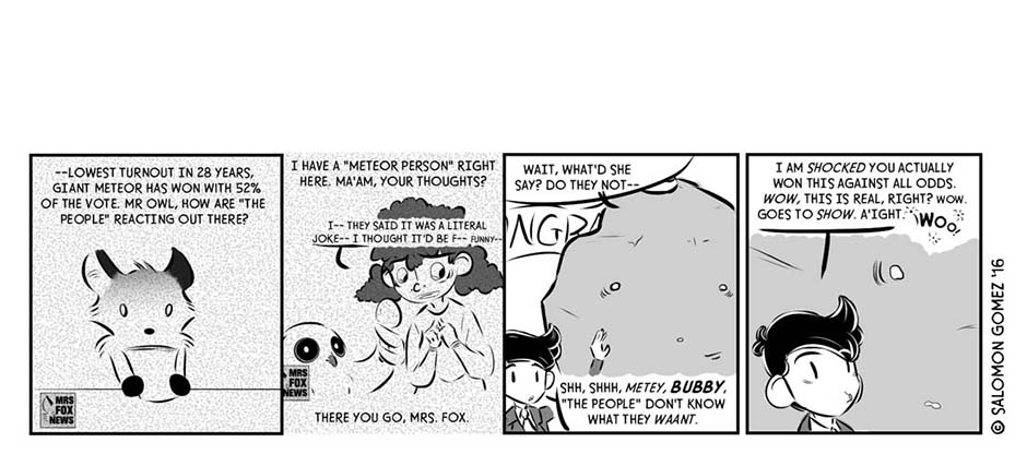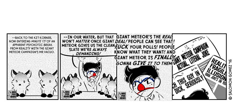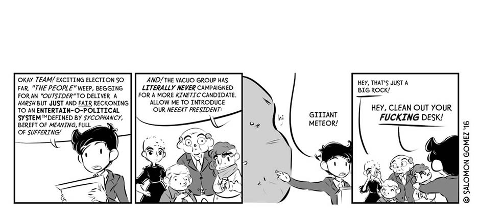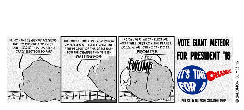 [Published Oct. 2016] During a chaotic, fraught election season in a world different from but eerily similar to our own, one mercenary consultant-turned-campaign manager (Antau) sees an opportunity to give “The People” what they want: sweet release, in the form of a Giant Meteor presidency.