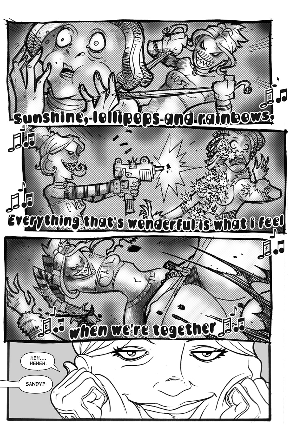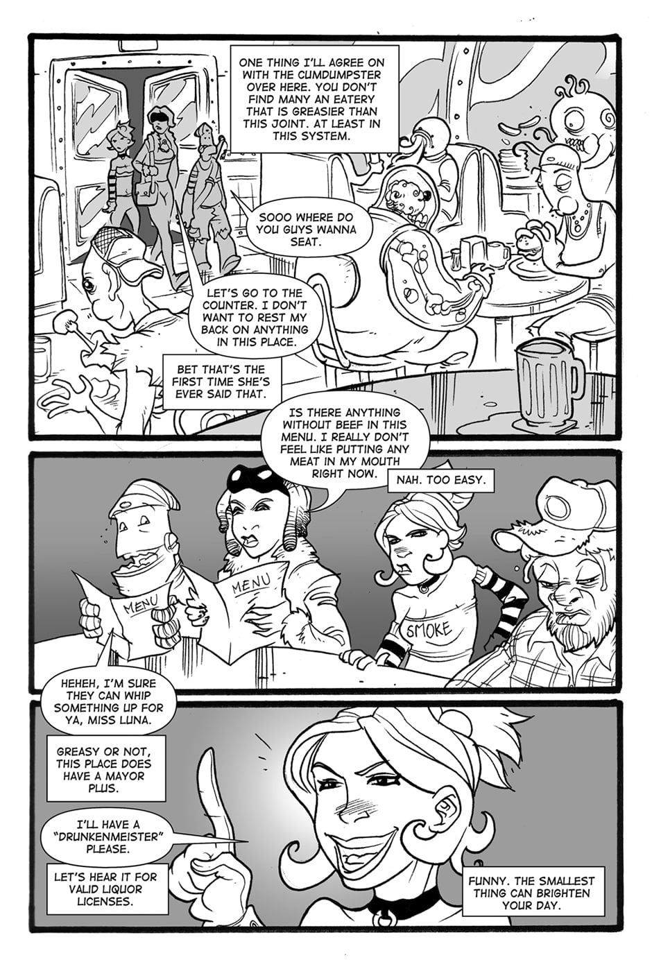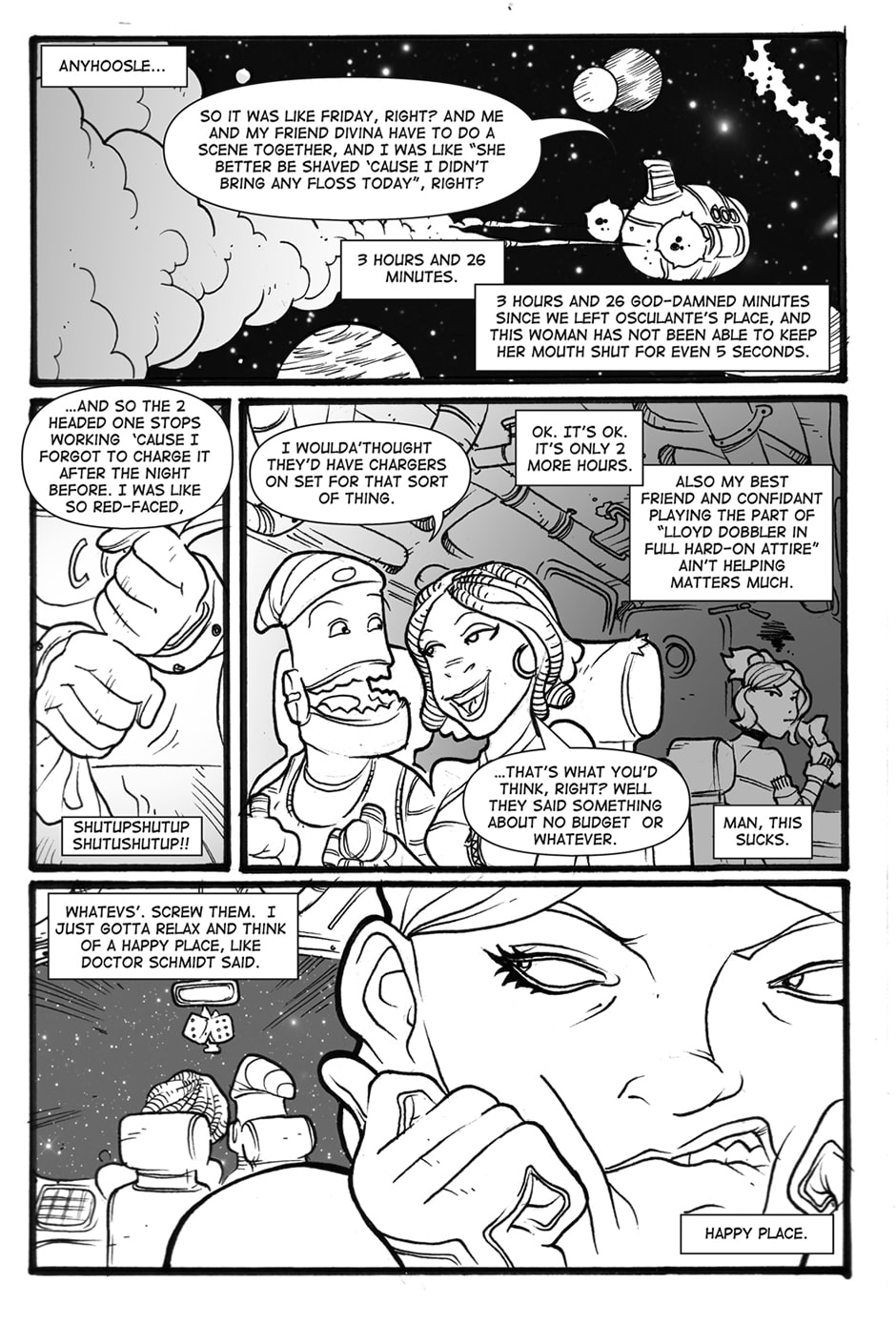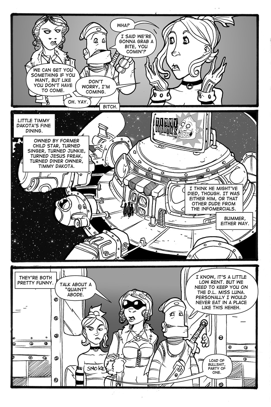 A long time ago, in a galaxy far far away…well it wasn’t THAT long ago, I mean it wasn’t like yesterday or anything…wasn’t like that far away either…wait…let me start over. These are the adventures of Sandy, a smart mouthed girl with a lust for cash, and Angus, a robot in cargo shorts with some anger issues, and how they go through the galaxy doing whatever it takes to make rent on their 3 bedroom spaceship, “The Millenium Trollop”.