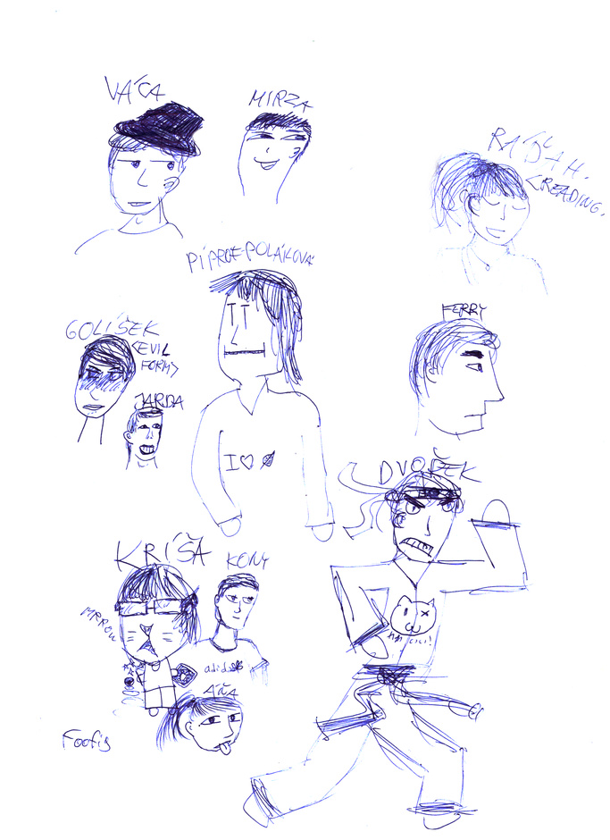 This is a sheet in my Math notebook I've drawn at school. All the peoples here are real people, just a bit over the top. I really need to learn to get the face proportions right...