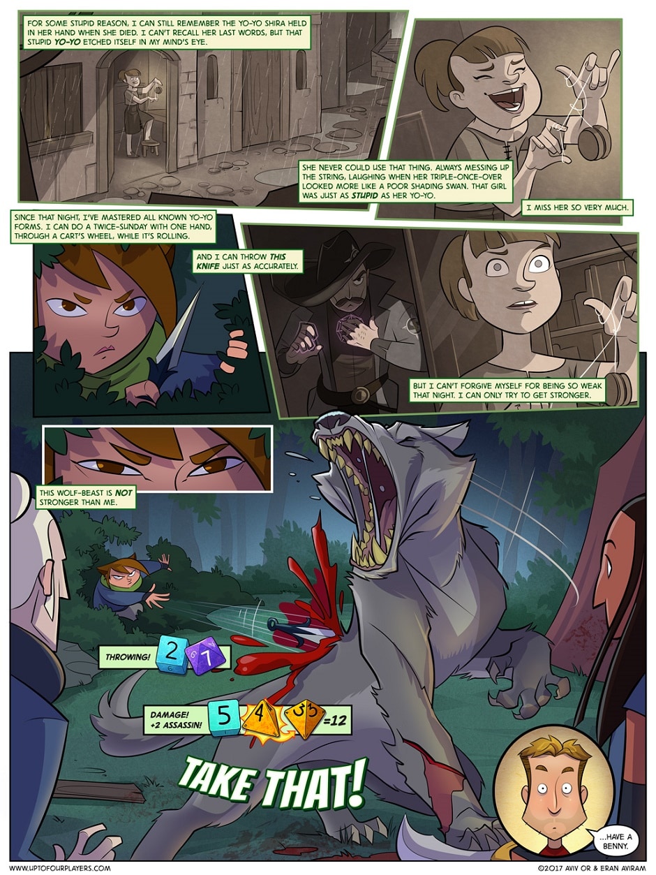 There are three main ways to add a colourful description to an action: Detailing the results of what's happening; detailing the way it's happening; and detailing why it's happening. http://www.uptofourplayers.com/comic/wild-heart-page-11/