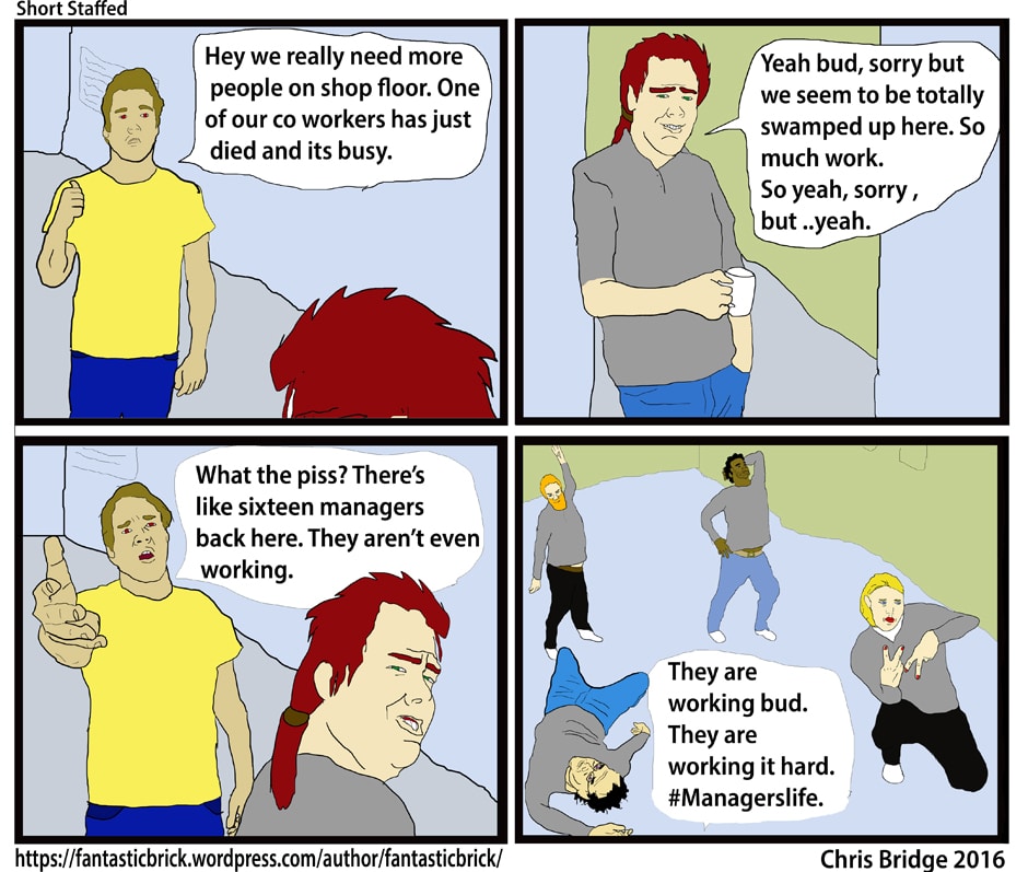 I once worked in a shop where the managers out numbered the workers.