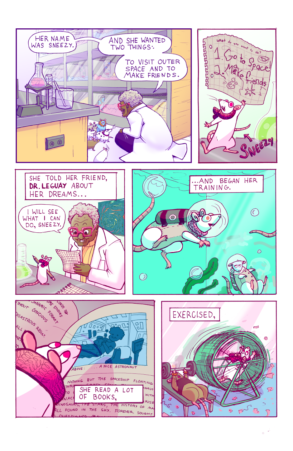 Sneezy, a naive lab rat, finally achieves her big dream of going to outer-space. She and her ratsonaut friends are given a secret mission to help the human astronauts, but will things go all according to plan? Can these small rats really be that big a help? Updates Monday mornings.