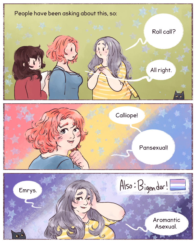 We've got all kinds here. I, for example, have always known I was asexual and some kind of trans. Cal, too, basically always knew. We've got dear Lotte, who found out later (as many of our friends have) and then Brandi.