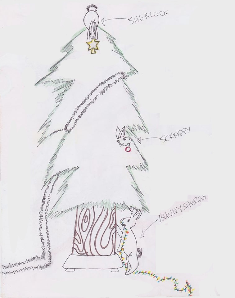 Scrappy, the paranoid and slightly skittish one is hiding in the tree, but still wants to participate. If my husband were a rabbit, he'd be Scrappy; they're way too much alike.