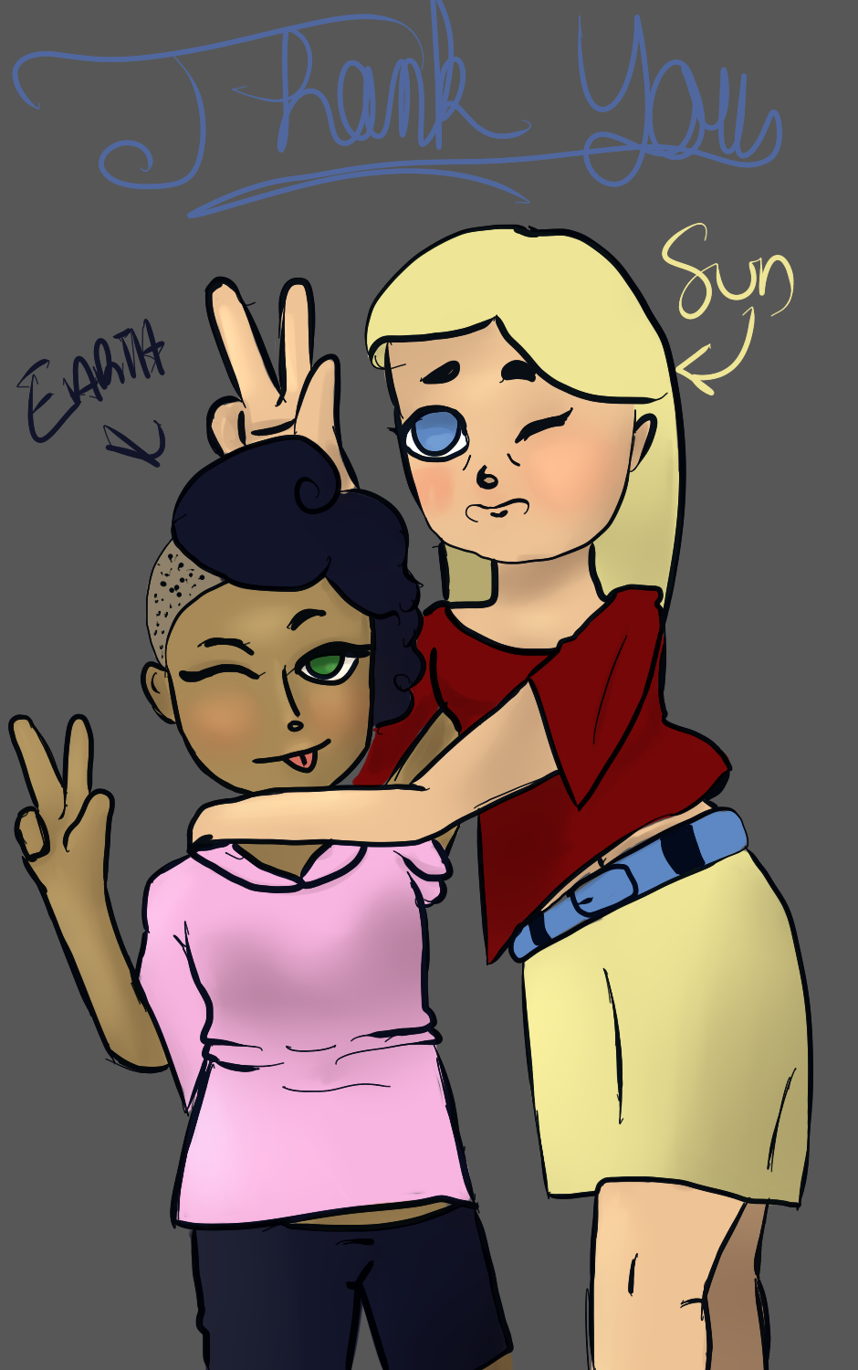 Hey guys thanks for being so patient. There are only like five of you but I still appreciate the waiting and lack of complaints. I humanized Earth and Sun and gave them up-to-date fashion and hairstyles. I really enjoyed it!