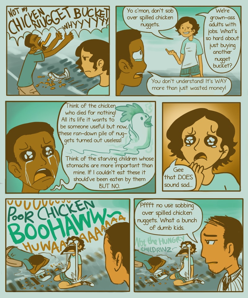 Wasted chicken nuggets is sadder than you think. The last panels are probably how 30-yr-olds view 20-yr-olds
