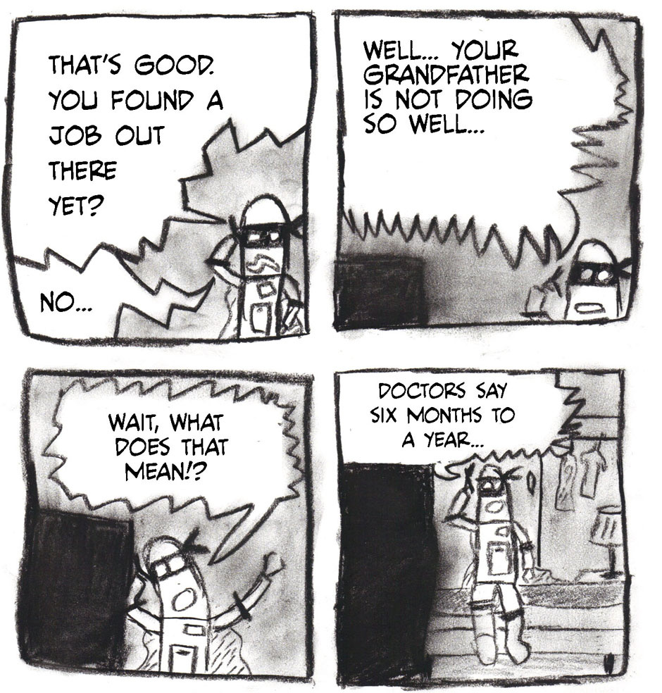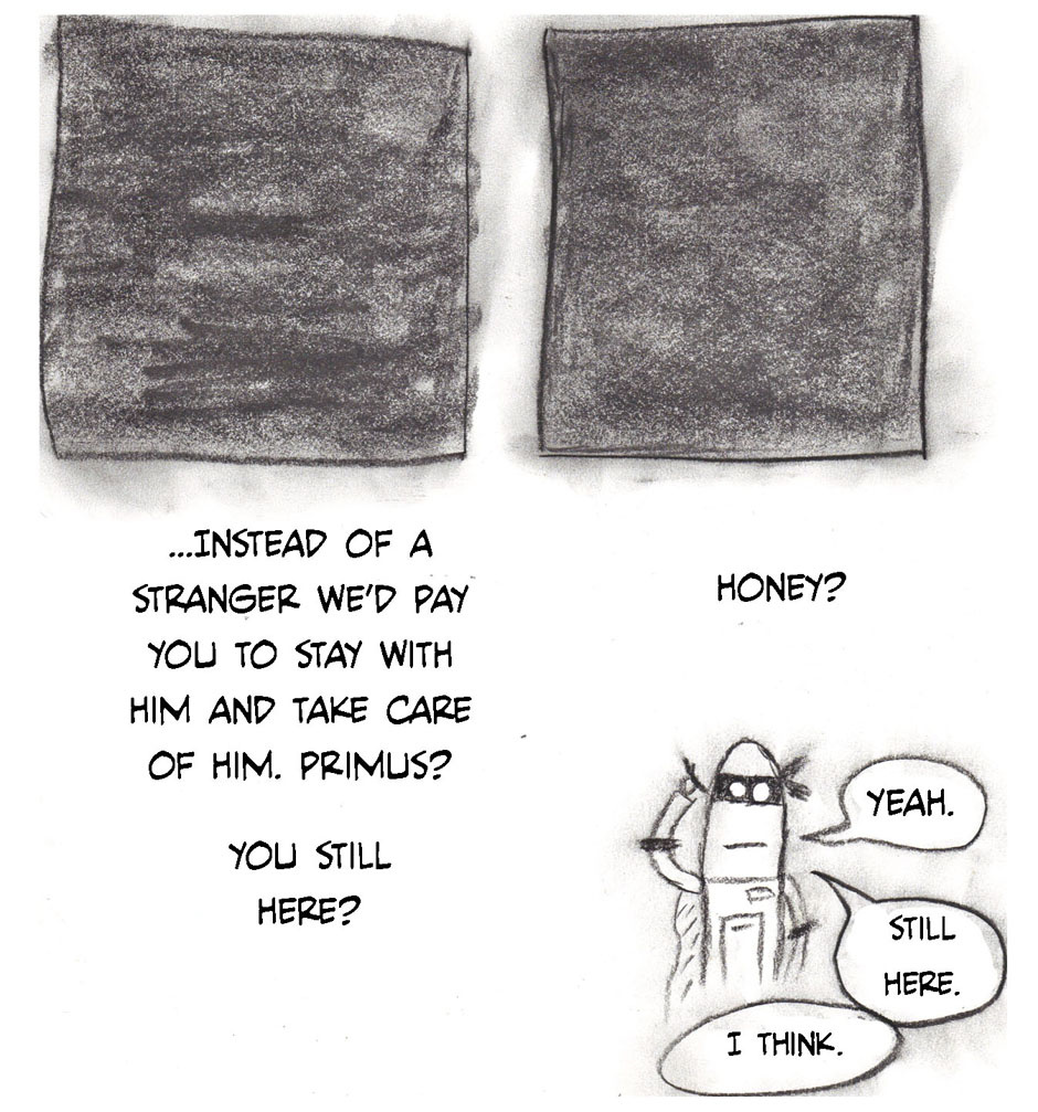 These were mostly made between January of 2009 and November 2011. Each of those years saw a 20-30 page issue of Scrambled Circuits released by Cameron Callahan consisting of short stories starring the robot Primus and his attempts to connect with the people around him (and sometimes his attempts to avoid them). This is every story in the first three issues in chronological order from the perspective of Primus.