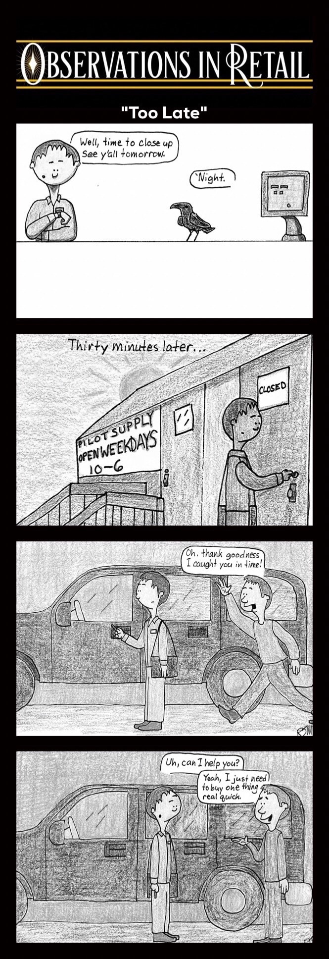 Pete and Ash work retail, which wouldn't be so bad if it weren't for one thing: customers. Join them in their never-ending struggle to deal with the daily stupidity and poor attitudes of the shoppers who walk through their doors, while trying to figure out how they ended up stuck in retail limbo.