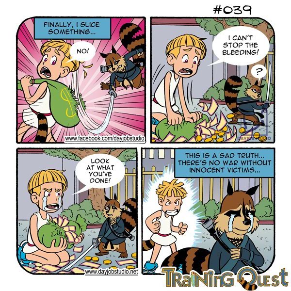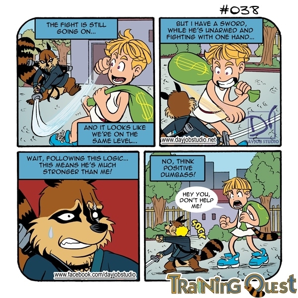Training Quest is a comic strip which parodizes the shonen manga genre. We love this genre and we're indeed realizing another shonen manga and decided to create this strip to make fun of the genre tropes and fill it with ideas either too ridicolous or outrageous to fit in the other story. It's silly and we love it. If you'll love it too, please share it!
