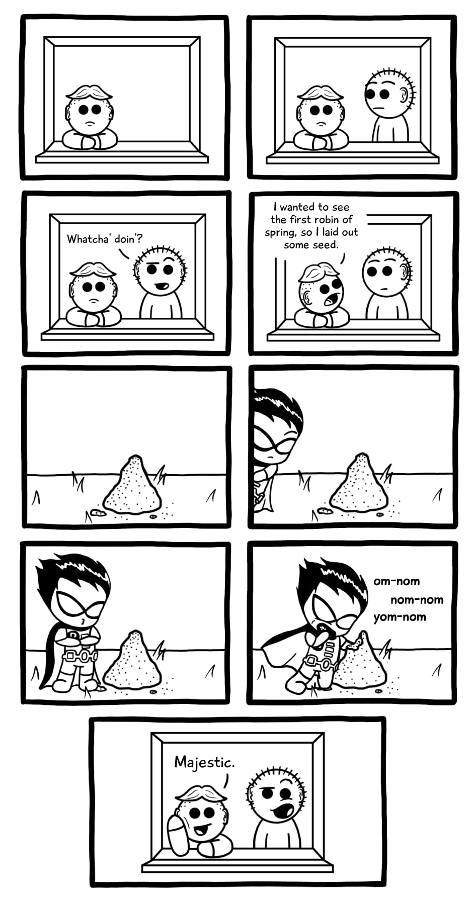 Can't tell if play on animal-named heroes, criticism of Batman's neglectfulness, or of the disreputableness of sidekicks.