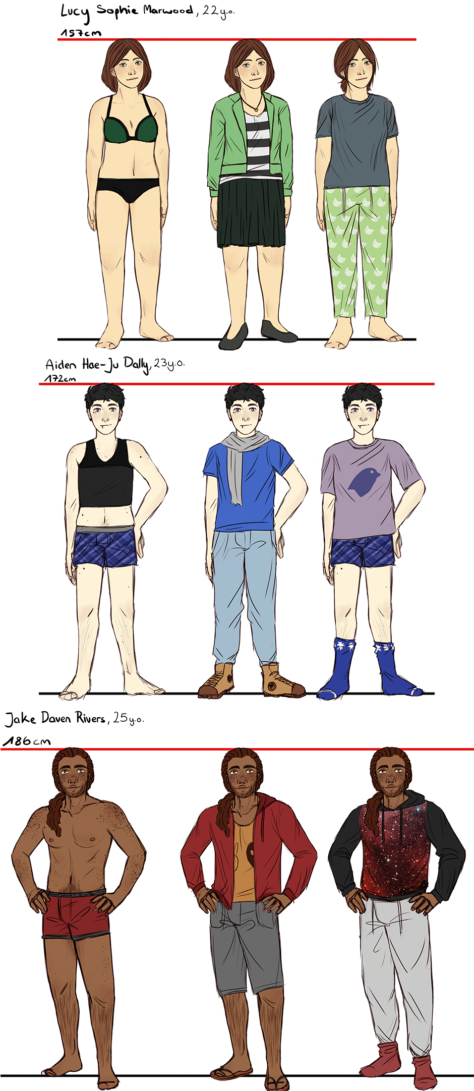 Before starting the next scene, I wanted to share the basic outfits and the sleepwear of the main characters :D