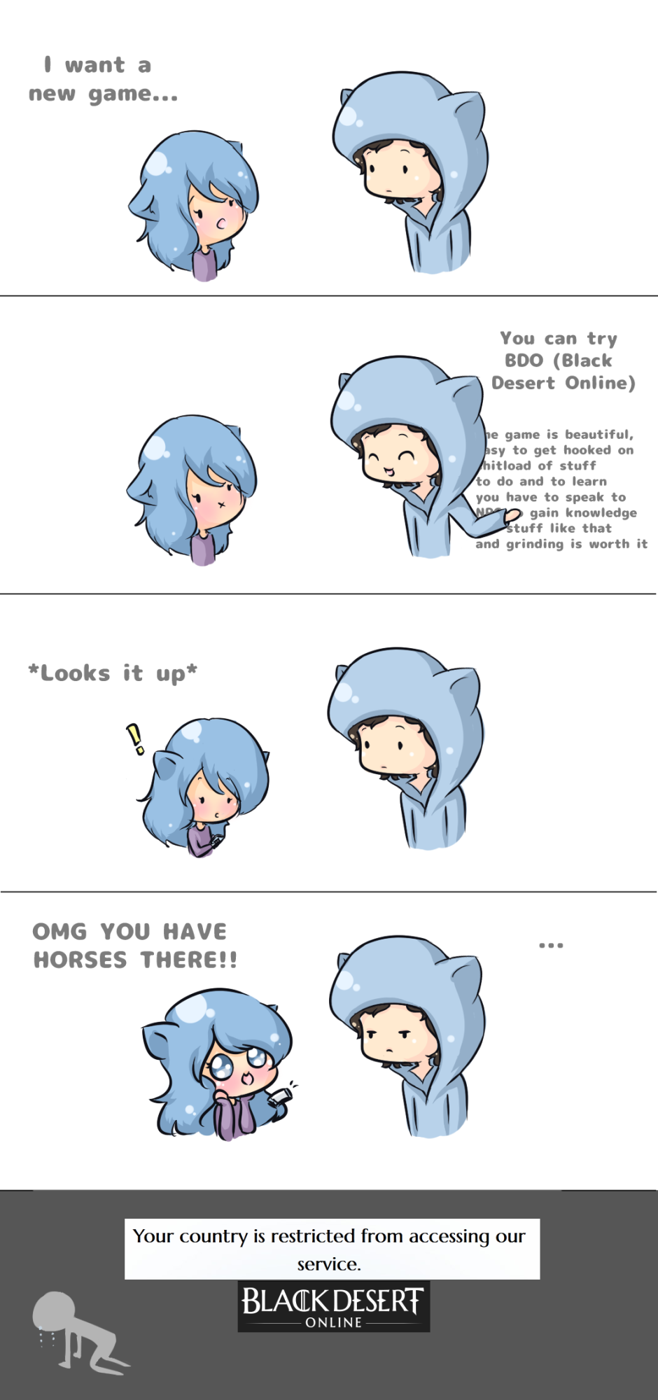 So... This is a real story and a convo between me and my friend ; u ; I wanted a new game and my friend suggested BDO... This is what happened ; u ;