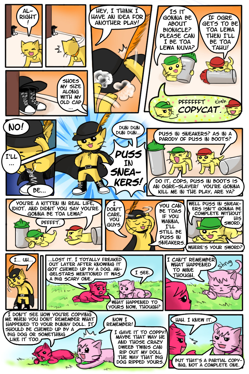 In here, Coppy dresses up as Puss in Sneakers due to him and the twins Ogre and Ranger wanting to make a stage play. All the while he's practicing to be in character wherever he goes.