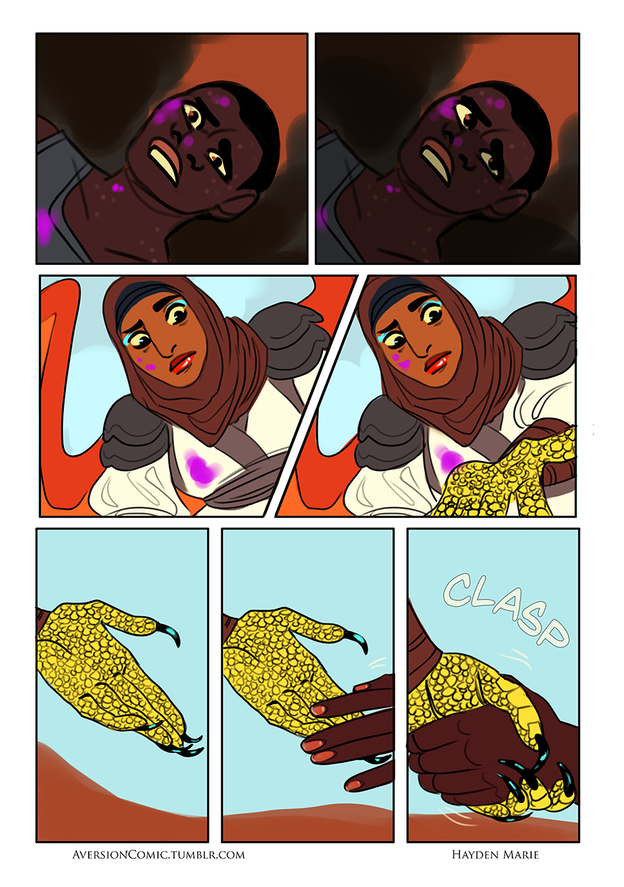 AVERSION is a webcomic about diner owner Gavin Snyder, a human unwillingly caught in the middle of the Endless War of Heaven and Hell, and the angel Nadhirrah, assigned to protect him.