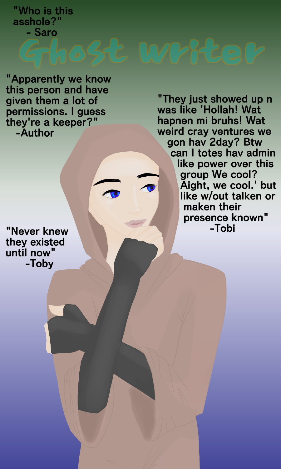 We will be keeping a close eye on this one. If you or anyone you know witness this ghostwriter doing evil magics or behaving in concerning ways, notify us immediately. For your own safety, it is important to not engage this person until we deem them safe for public interactions. Thank you for your time and understanding.