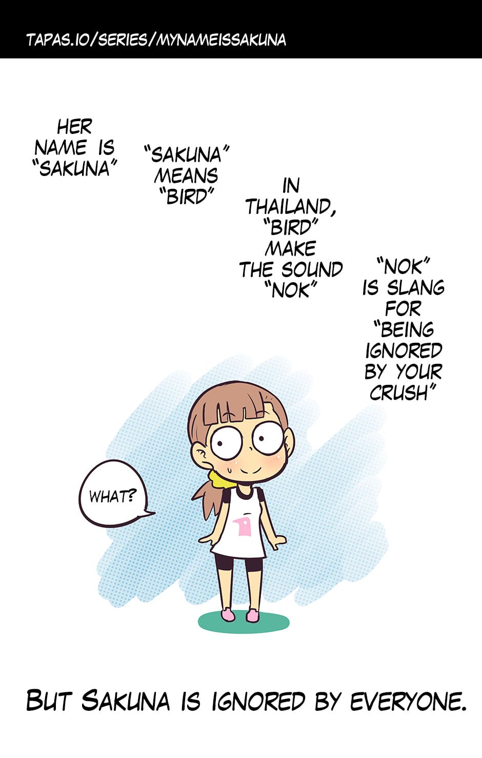 Cute art style but some serious translation errors. It would've been better as: Her name is "Sakuna" "Sakuna" means "Bird" In japanese, "Birds" make the sound "Nok" "Nok" is slang for "being ignored by your crush" But Sakuna is ignored by everyone.