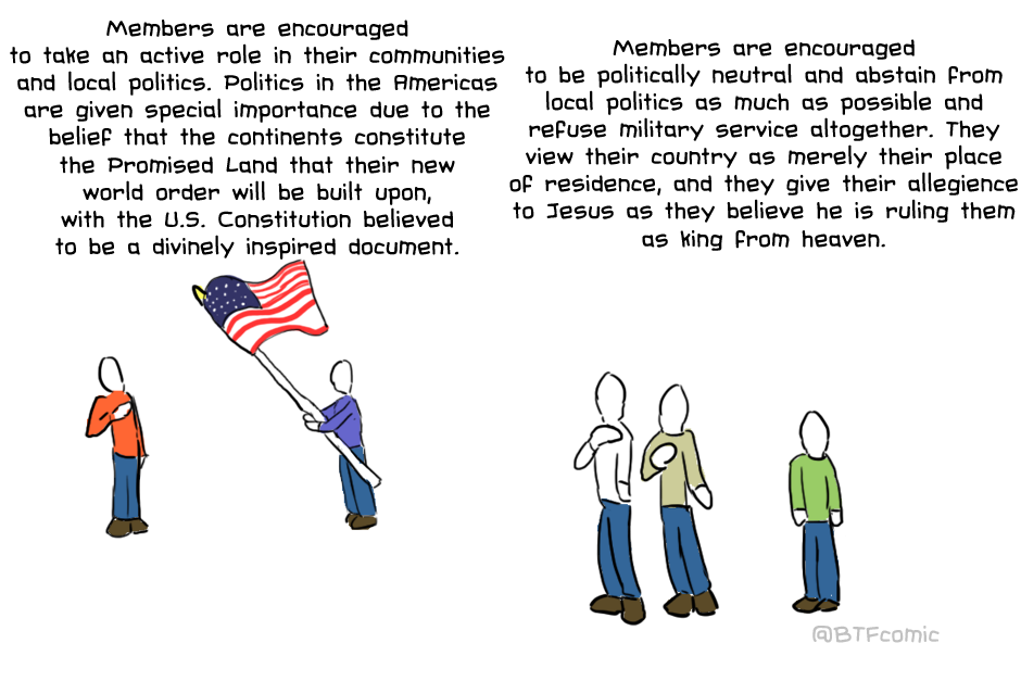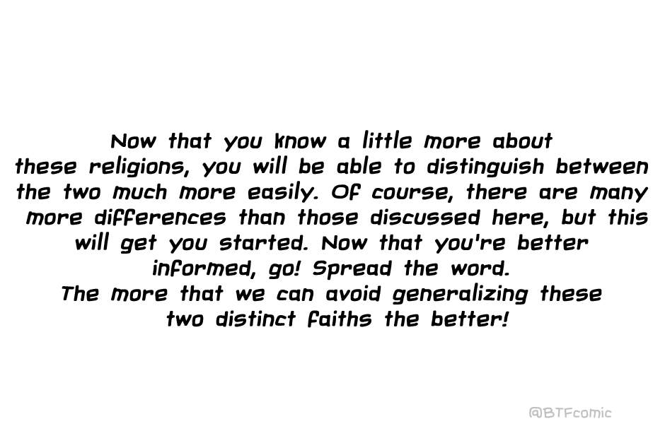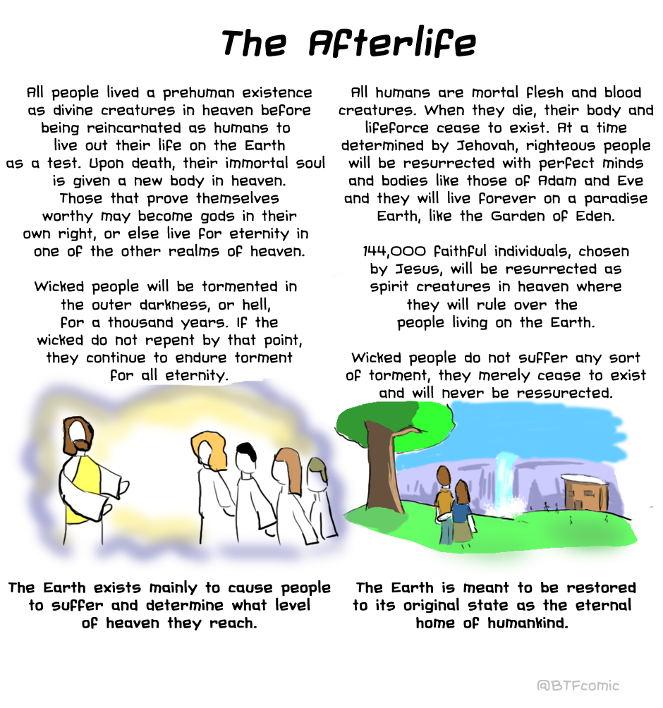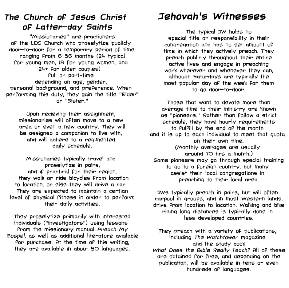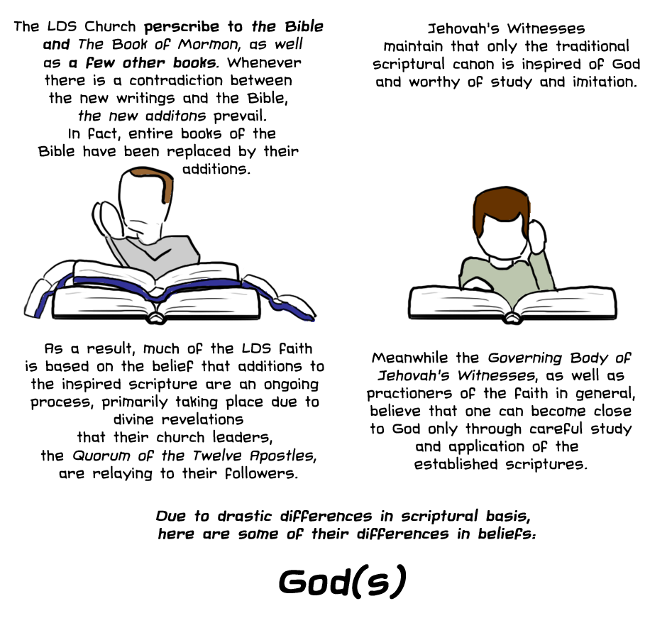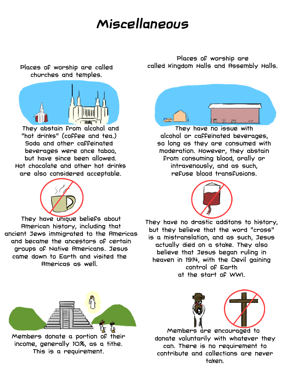 So after being confused with being LDS (Mormon) several times in my life, I decided to make this infographic to explain the differences between LDS and JW. I tried to be as unbiased as possible, but practicing is much different than simply researching a religion, and I may have gotten a few details about the LDS church wrong. Overall, though, I hope this webtoon will clear up misconceptions people have about both religions!