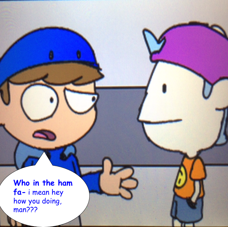 Enter the clumsy kid in blue...Blue and some other characters and such