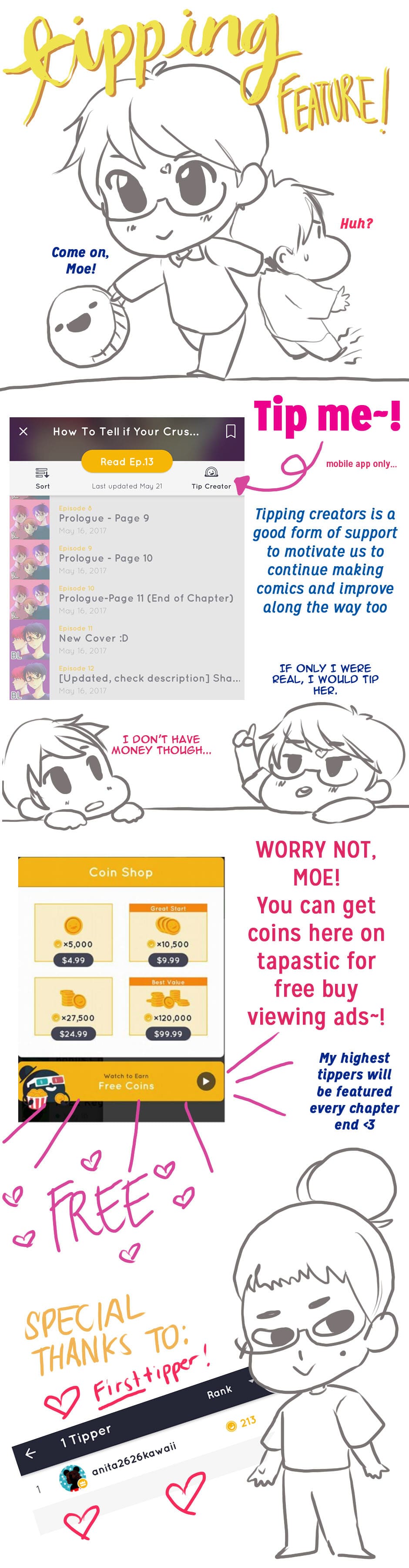 I'm excited to announce that I got my Tipping feature enabled! Now you can support me without having to buy merch or be my patron <3 Top Tippers will get special mentions and even drawings from me every end of the chapter~~
