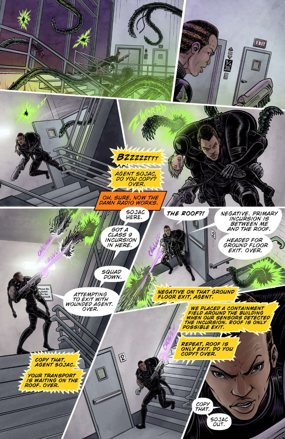 As you may have gathered from the way she’s running while carrying Cordy, Agent Sojac is stronger than an ordinary human. Also faster, tougher, more agile… and, at the moment, more annoyed.