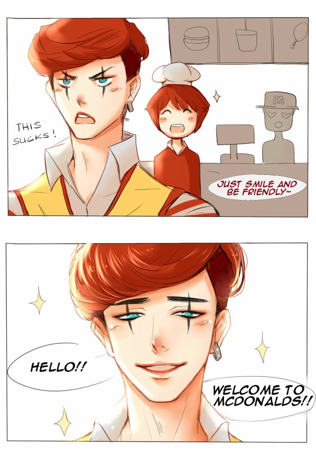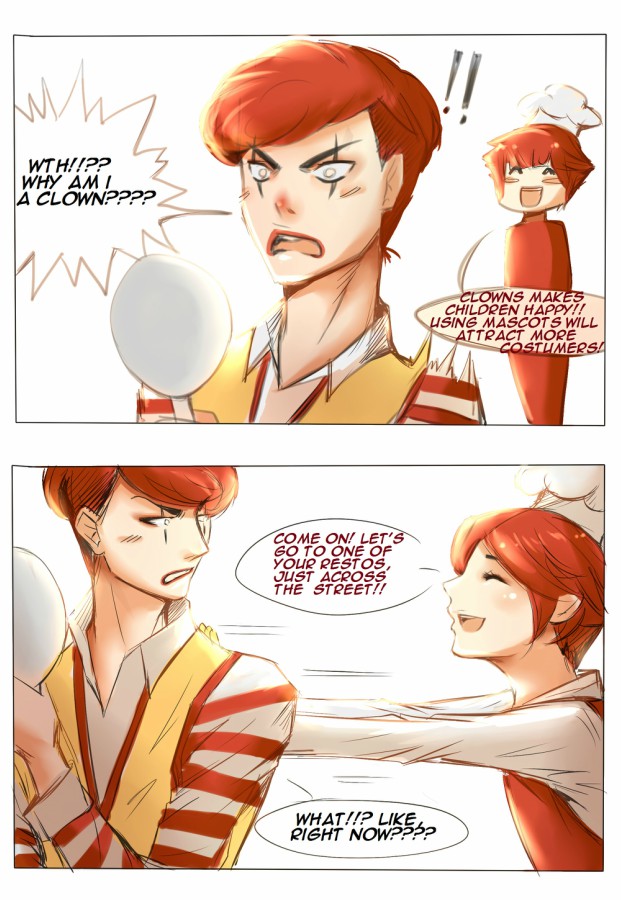 Tbh, I'm scared of clowns. So obviously, I don't like McDonald's mascot. His smile is so freaking huge like gaaahh-- but G A S P you made him so hot I forgot I should be scared. lol. Now I'm also "Anakan mo ko plis!" hahahahaha