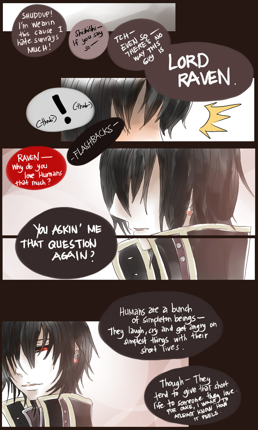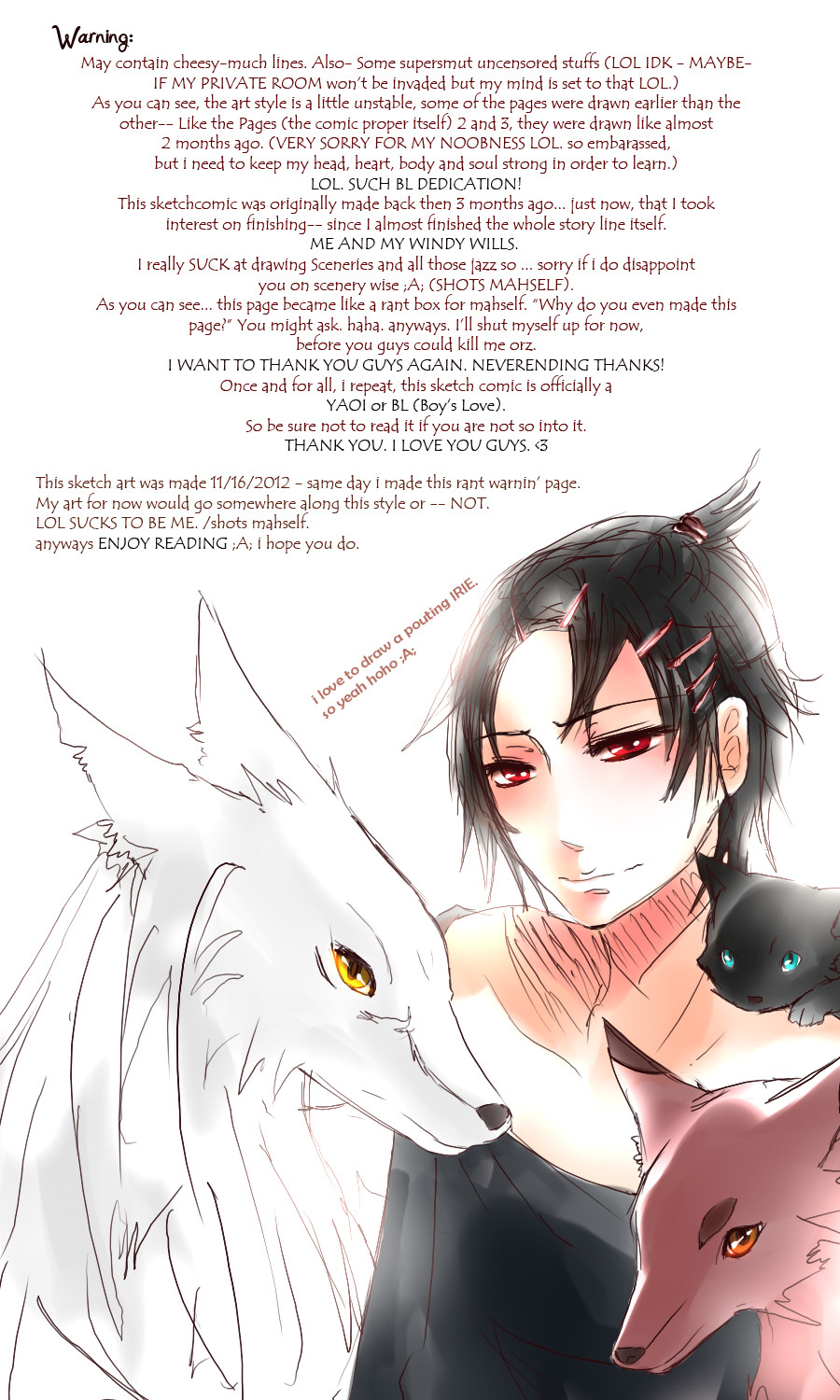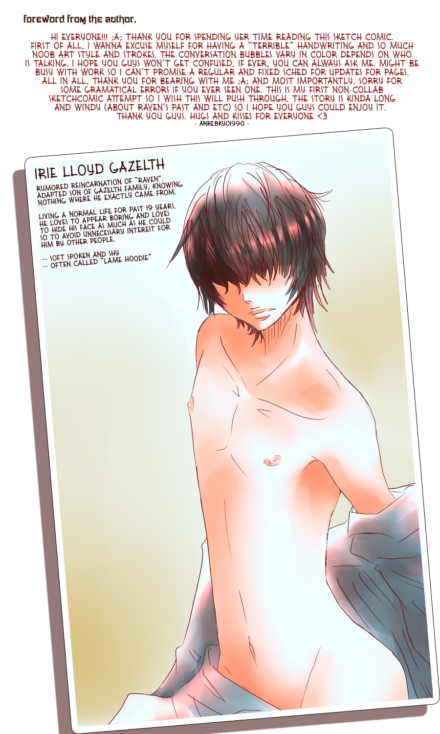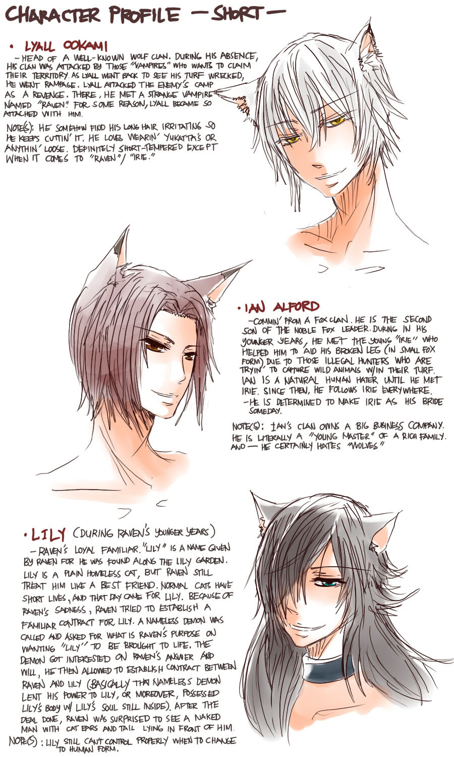 A bl/yaoi sketch webcomic that revolves around Irie Lloyd, a supposed-to-be normal 19-year old college student, turned out to be a reincarnation of "Raven". Raven is one of the oldest noble pureblood vampire known as the Black Bird. His bestfriend, Ian, who turns out to be an Astral Fox. The cat he's petting for years, Lily, who turns out to be his old familiar back then (a cat demon spectre). And the wolf who he sealed for long time, Lyall, who turns out to be his past lover. What will happen to Irie's normal human life? Would it remain the same? What are the secrets to be told about his own whole-being?