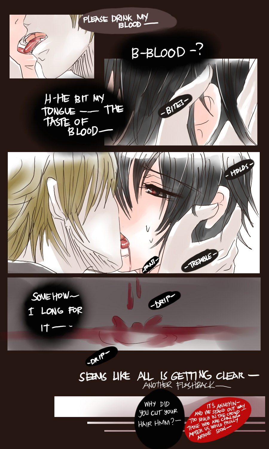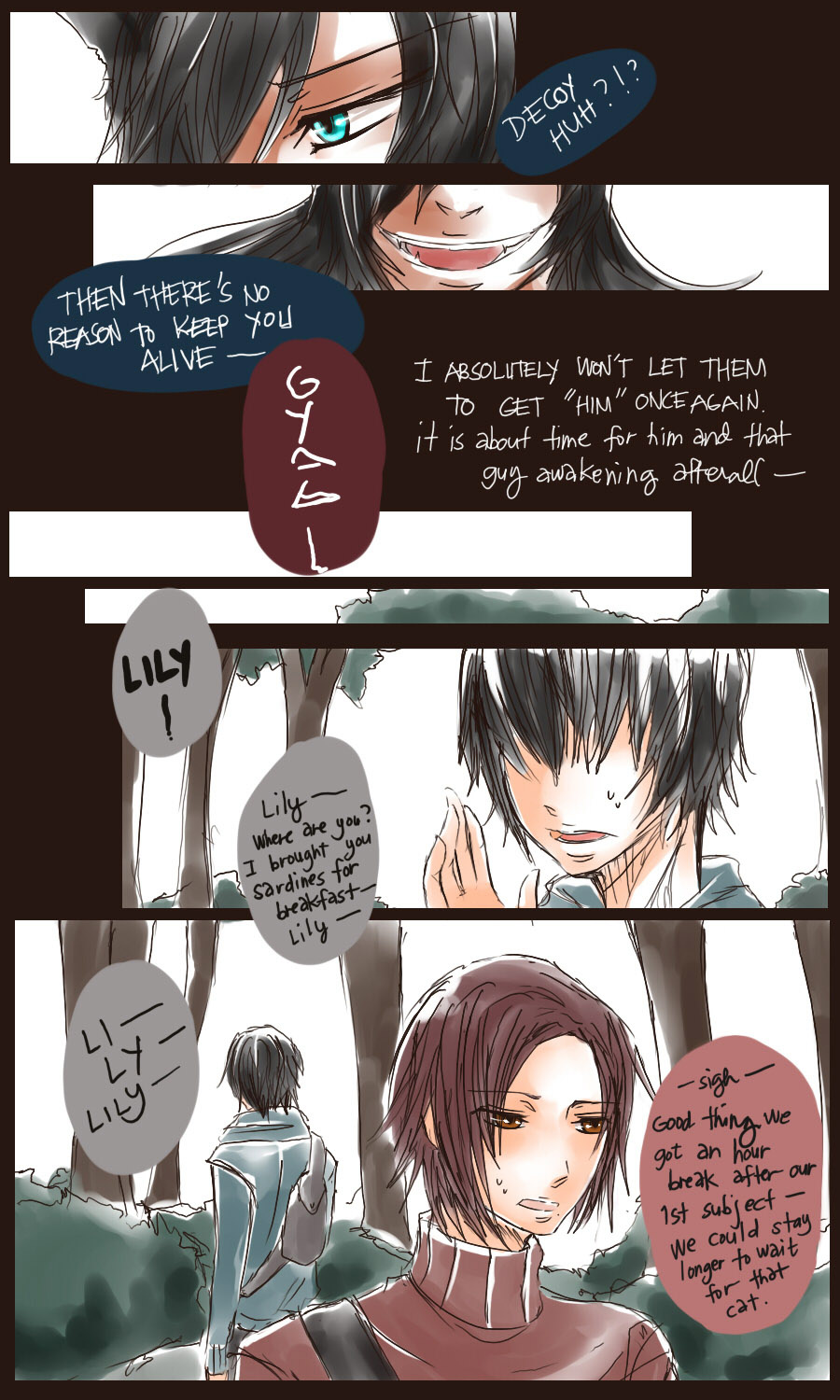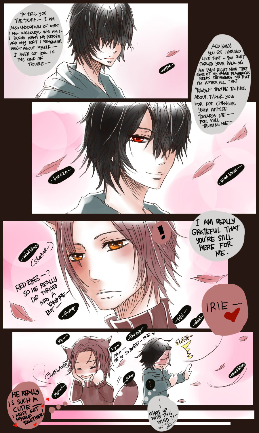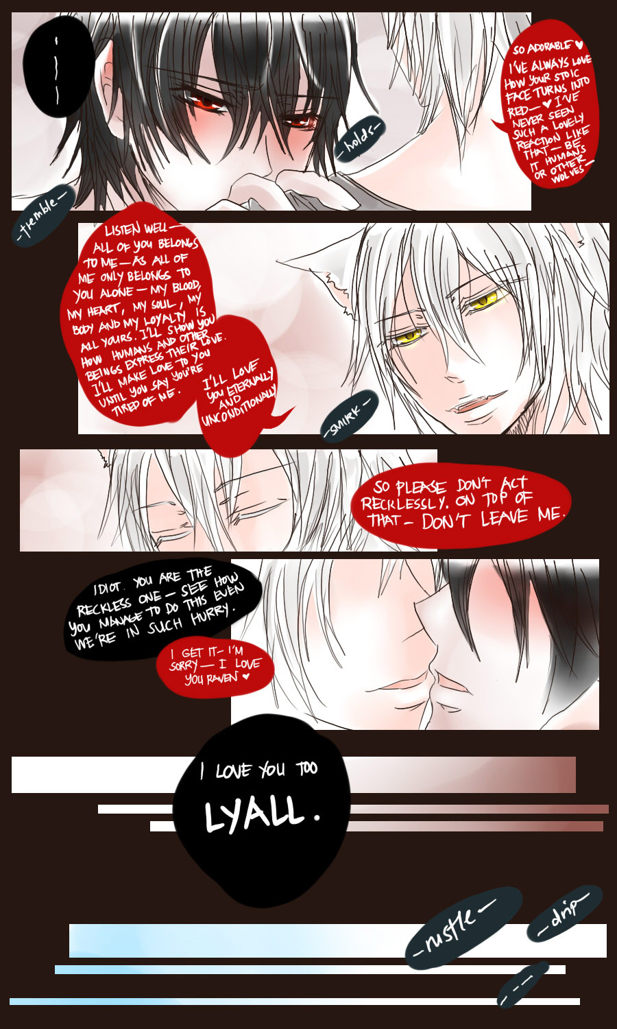 A bl/yaoi sketch webcomic that revolves around Irie Lloyd, a supposed-to-be normal 19-year old college student, turned out to be a reincarnation of "Raven". Raven is one of the oldest noble pureblood vampire known as the Black Bird. His bestfriend, Ian, who turns out to be an Astral Fox. The cat he's petting for years, Lily, who turns out to be his old familiar back then (a cat demon spectre). And the wolf who he sealed for long time, Lyall, who turns out to be his past lover. What will happen to Irie's normal human life? Would it remain the same? What are the secrets to be told about his own whole-being?