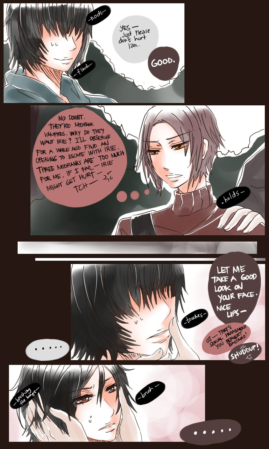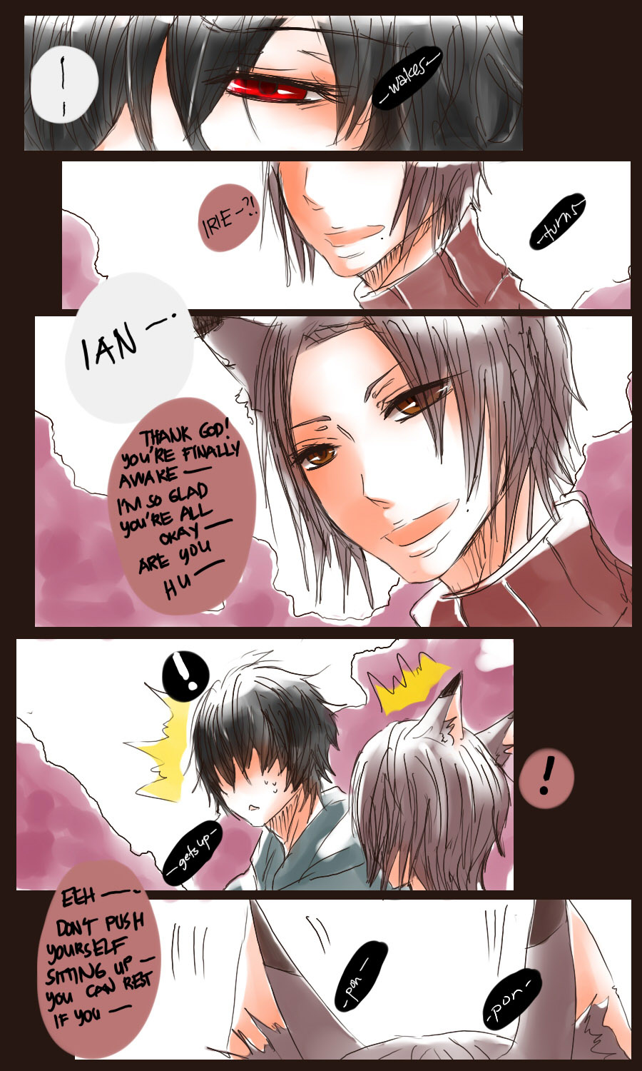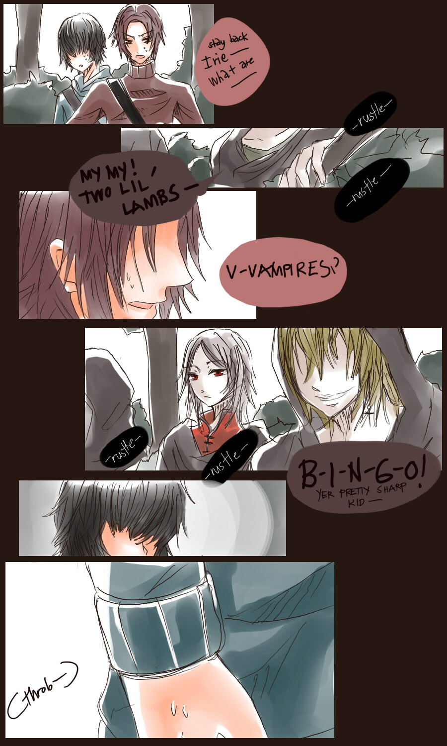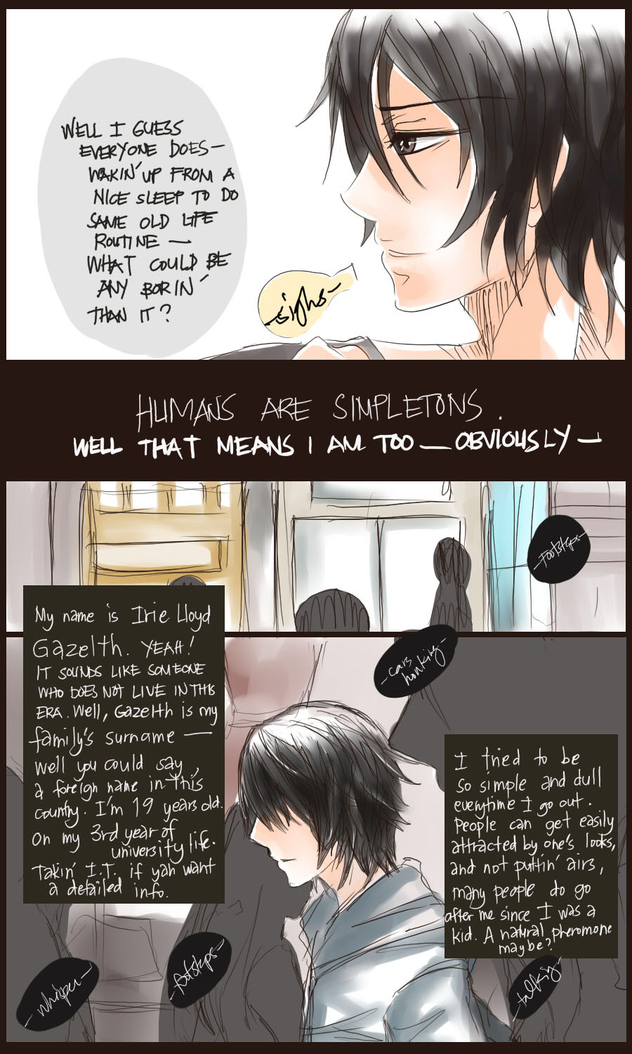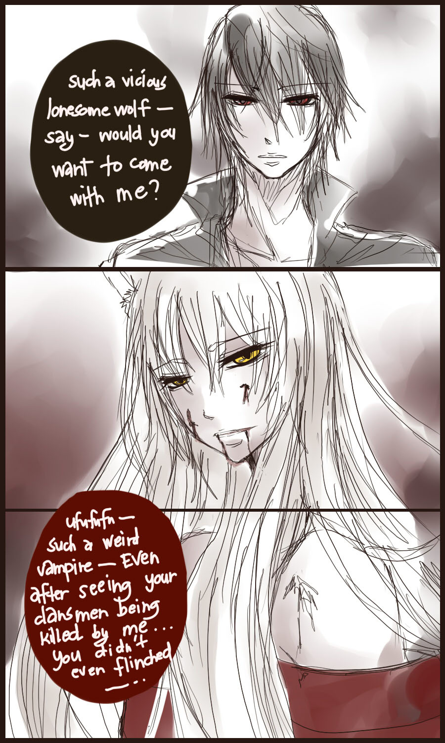 A bl/yaoi sketch webcomic that revolves around Irie Lloyd, a supposed-to-be normal 19-year old college student, turned out to be a reincarnation of "Raven". Raven is one of the oldest noble pureblood vampire known as the Black Bird. His bestfriend, Ian, who turns out to be an Astral Fox. The cat he's petting for years, Lily, who turns out to be his old familiar back then (a cat demon spectre). And the wolf who he sealed for long time, Lyall, who turns out to be his past lover. What will happen to Irie's normal human life? Would it remain the same? What are the secrets to be told about his own whole-being?