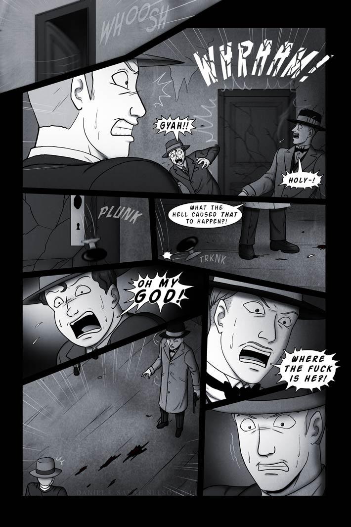 Now onto this page…unfortunately not the greatest comeback page ever, but still, the tension continues to build. XP The door suddenly slams shut VERY hard, seemingly by itself, to the point of cracking and losing it’s knob. The three had their eyes on that for a few seconds, only to return their attention to Daniel, who is now no longer on the floor, or anywhere in sight for that matter.