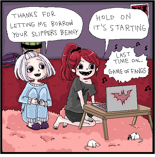 Third Eye Film Festival was packed last weekend! Thanks for waiting the extra week for this strip :3 I've been obsessed with the new Twin Peaks but couldn't come up with a good VHS pun to make it happen. I guess I could have gone with Twin Fangs. Maybe I'll make some side art just for fun... >.>