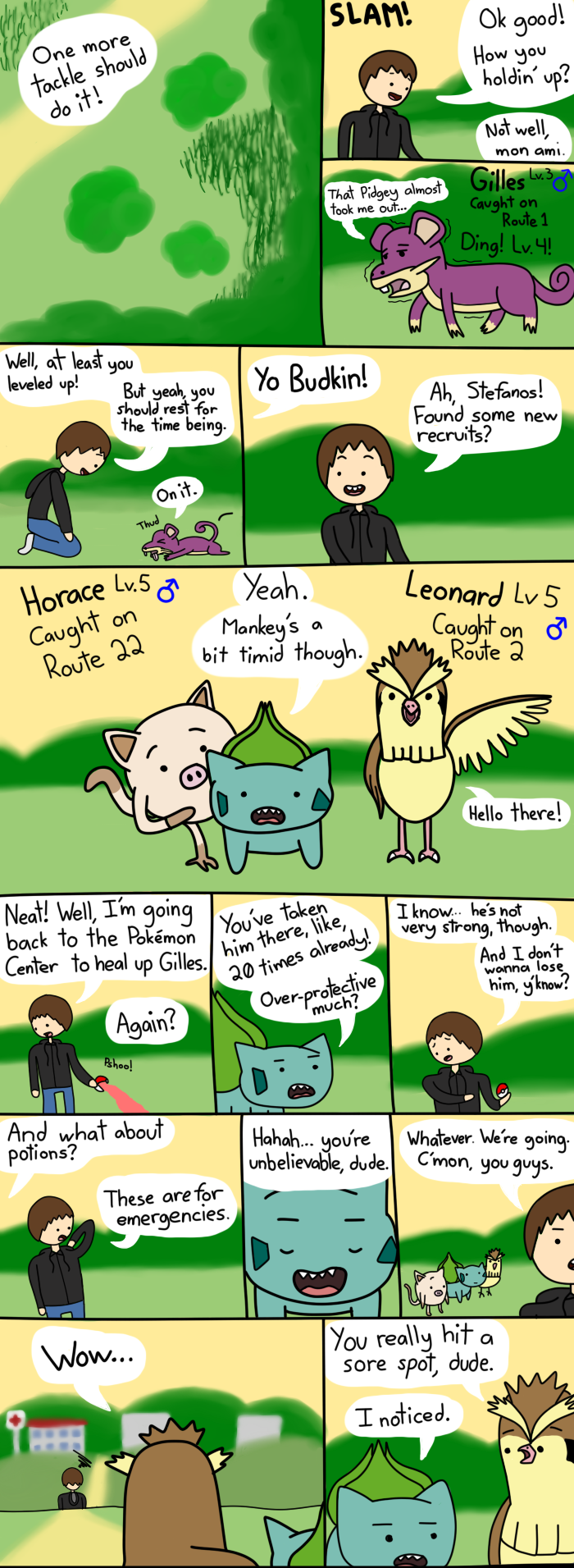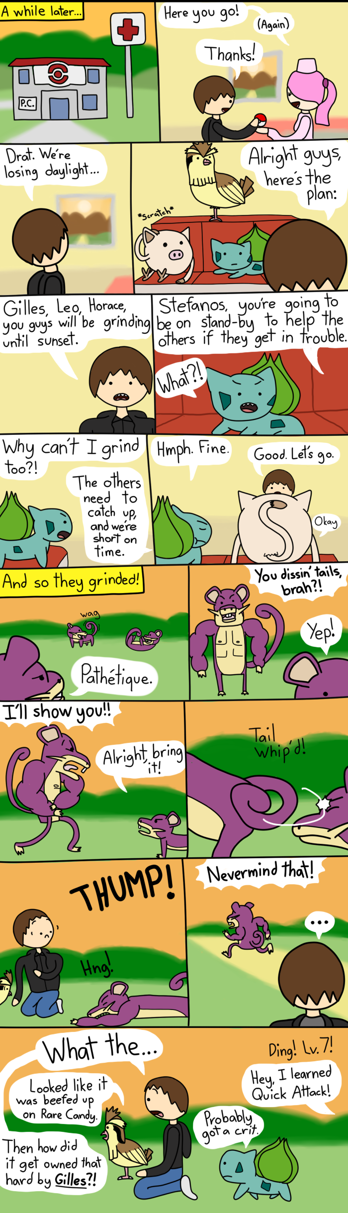 This comic's ending was pretty much improvised. I only planned to have Gilles take out the other Rattatas, but I drew the muscle rattata out of the blue and it just... stuck.