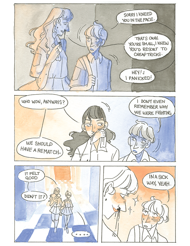 I forgot to mention this was another comic I did for my Drawing class in the spring, so I challenged myself not only with the Blue/ Orange palette, but also trying to make every page look different using those two colours. I think this was the most effective experimental page???