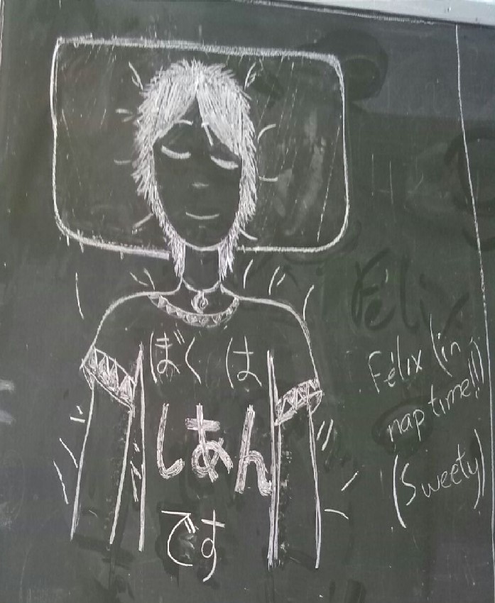 Hi! Here it's me sleeping, drawn in the blackboard of my ex-class, since I don't attend to that school anymore. Old, this one is old. Félix isn't my real name, so don't take it too seriously.