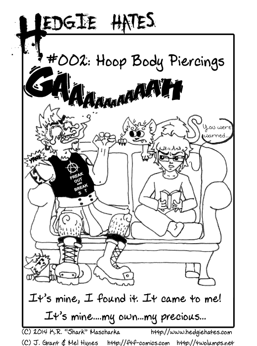 Another strip also based on actual experiences. Hedgehogs also apparently like "shiny" things and most body piercings are...well shiny? And yes, the hedgie is under his shirt. Such never happened after this incident.