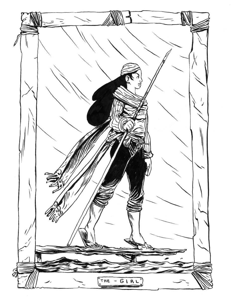 The girl is a member of a deep swampland tribe and has a warriors role of defending their territories. Her people have been oppressed by an evil wizard. She uses her long spear for both fishing and combat.