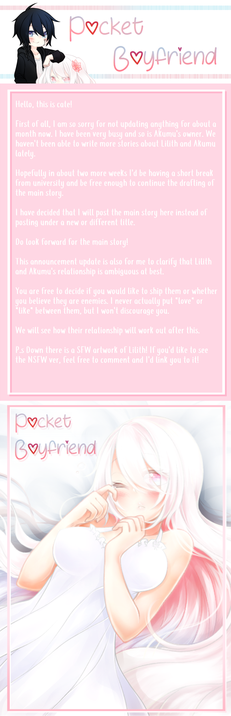 Again, I am sorry for no updates! Do wait a bit more, I promise not to disappoint with the main story ;;; (also small confession I have been following P101 and got my heart broken because Onibugi, Piggy boy, Byeongari and Sexy Bandit didn't make it, but I thank god for making sure King Daniel and Ong Slate and Jisung clap is in Wanna One//lmao if you follow P101 you'd get it)