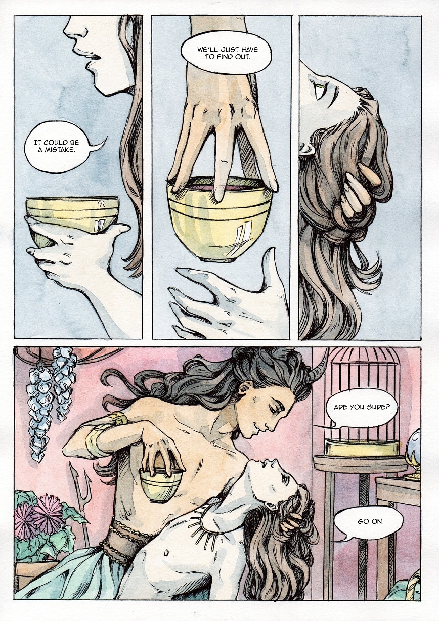 Your shadowing is so great, everything looks so natural and marvelous, and your characters are mermerizing. *-* Also, I'm in love with Serapis' hair on the third panel! And it is very pleasant to see the effort you put as always in backgrounds, with all those miscellaneous objects. They have their charm, it creates a special atmosphere that suits the story so much. Love it!