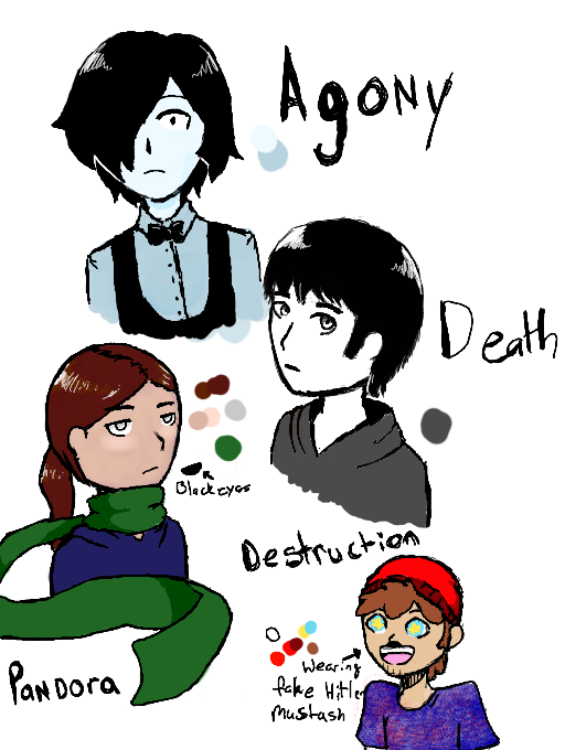 These 4 are the main characters from my story "Death My Prisoner" which came from my reimagination of the first seen of "A Matter of Live and Death" in which the human attacks Death instead of what actually happens. Pandora is the only human, the others are gods, and captures Death for personal reasons. Agony and Destruction are friends of Pandora and are stuck on Riro (the world in which this story takes place as well as all stories conected to it) because of something Madness (goddess) did which they may or may not have been involved with but were punished along with her anyway, but while Madness was sealed inside a human body (Pandora) the two were sent to protect that human and make sure Madness didn't break out. Having Madness inside of her had no effect on Pandora other than being constantly followed by Agony and Destruction instead of the short visits she got from them as a kid. Pandora is around 14 or 16 although she can't tell cause she was abandon by her family and lived on the streets ( all her education came from the streets and Agony and Destruction).