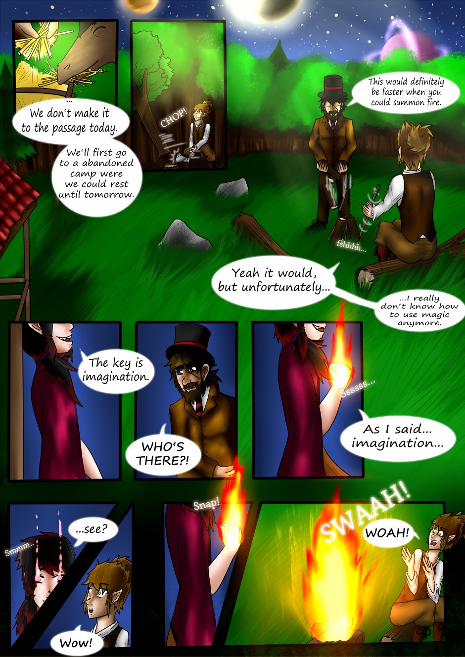Because the passageway is too far away to reach, Darion and the boy rest over the night at an abandoned camp.