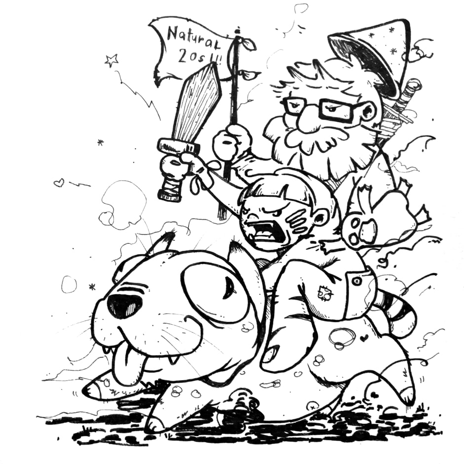 I also drew this character I made for DnD, a druid in a onesie with a buttflap and Hy’s character - a gnome with cog-like beard. It ain’t too hard to spot…they are on the 3rd panel with the derp cat.