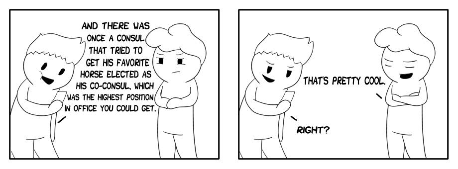I've been super busy with school recently. I'm entering my junior year in college and I'm taking really intense summer courses right now that takes up most of my time so it's been hard to make time to draw recently. I have another Pokemon comic in the works but it won't be done for a few more days and I didn't want to go without a comic any longer so I made this one in like an hour so it's sloppy and not colored BUT whatever. I made this because one of my summer courses is an ancient Roman history course and there are so many wild things those crazy people used to do and I find every single thing super cool.